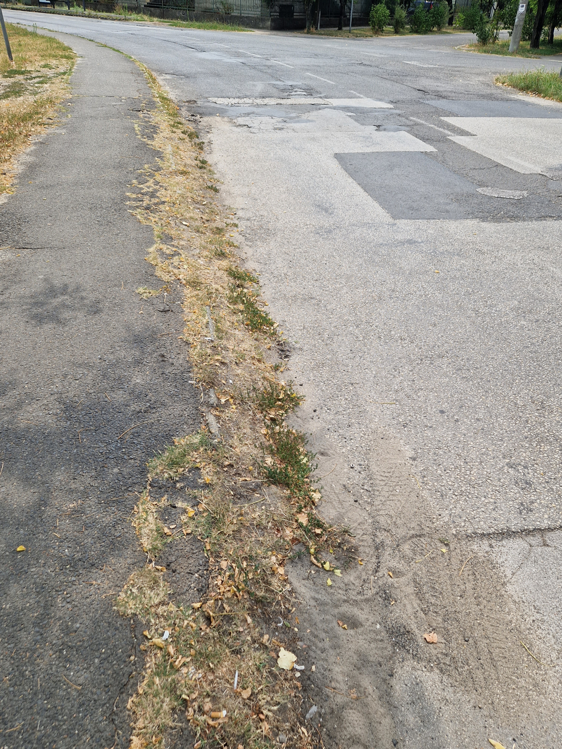 A képen látható járdaszegély igencsak elhanyagolt, gondozatlan. A rengeteg felgyült por és az abból kinőtt növényzet csúszás és balesetveszélyes.