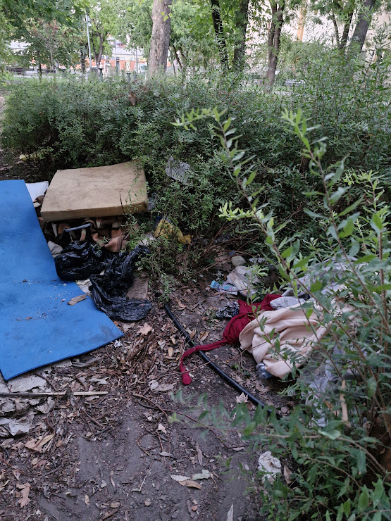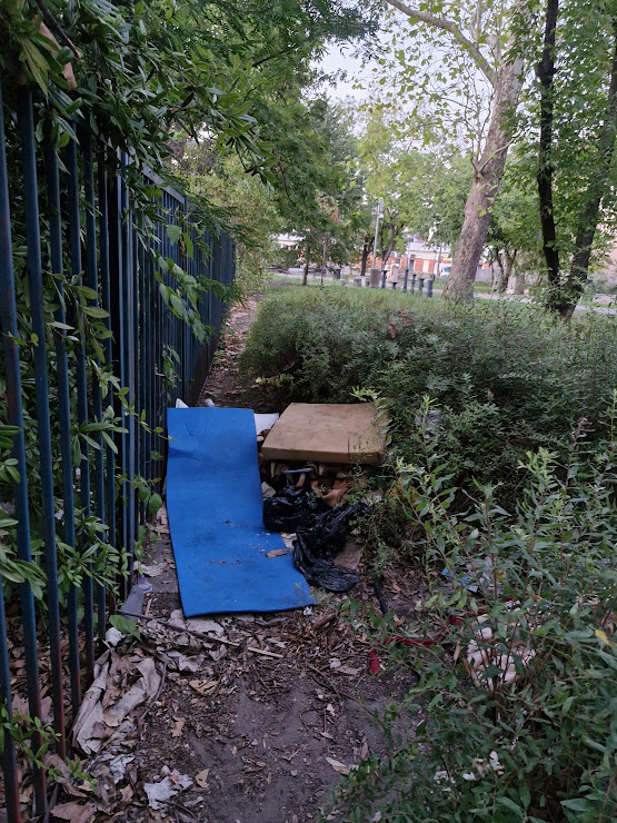 Összehordott szemét és mocsok a Bosnyák téri templomkert mellett a bokrosban. Kérjük a Mária út mellett levő mocsok eltüntetését.