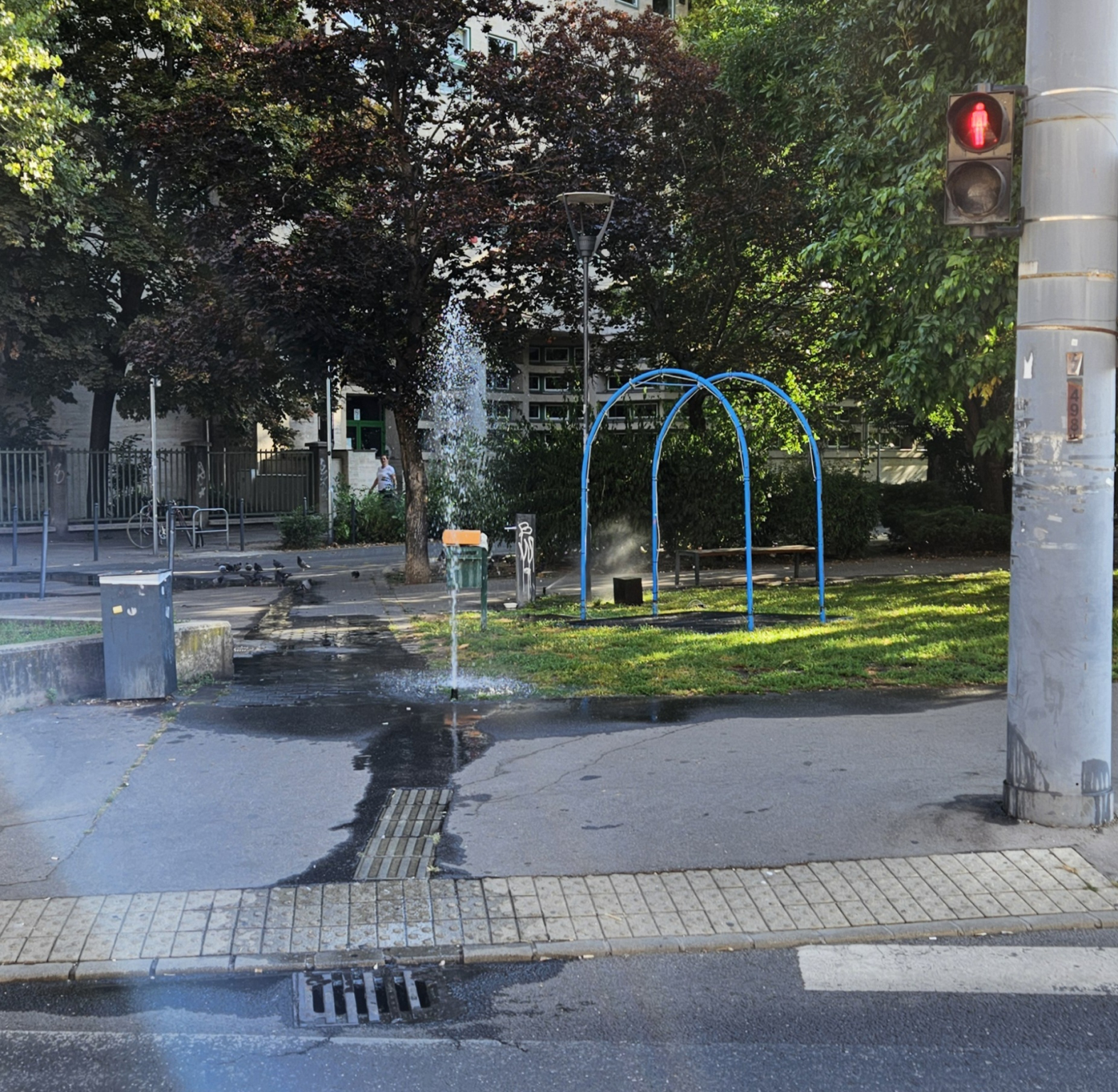 Bp. III. Katinyi mártírok parkjának nyugati sarkán található szórófej hibásan működik.
