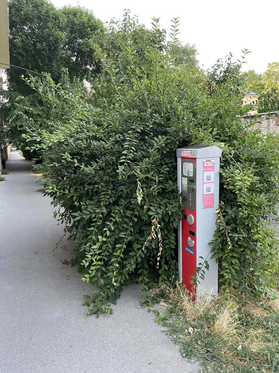 A 3. kerületben a Kenyeres és a zápor utca sarkán található parkoló automatát szinte már megette a növényzet. A Zápor utca felől nem is látszódik már, csak a Kenyeres utca irányából.