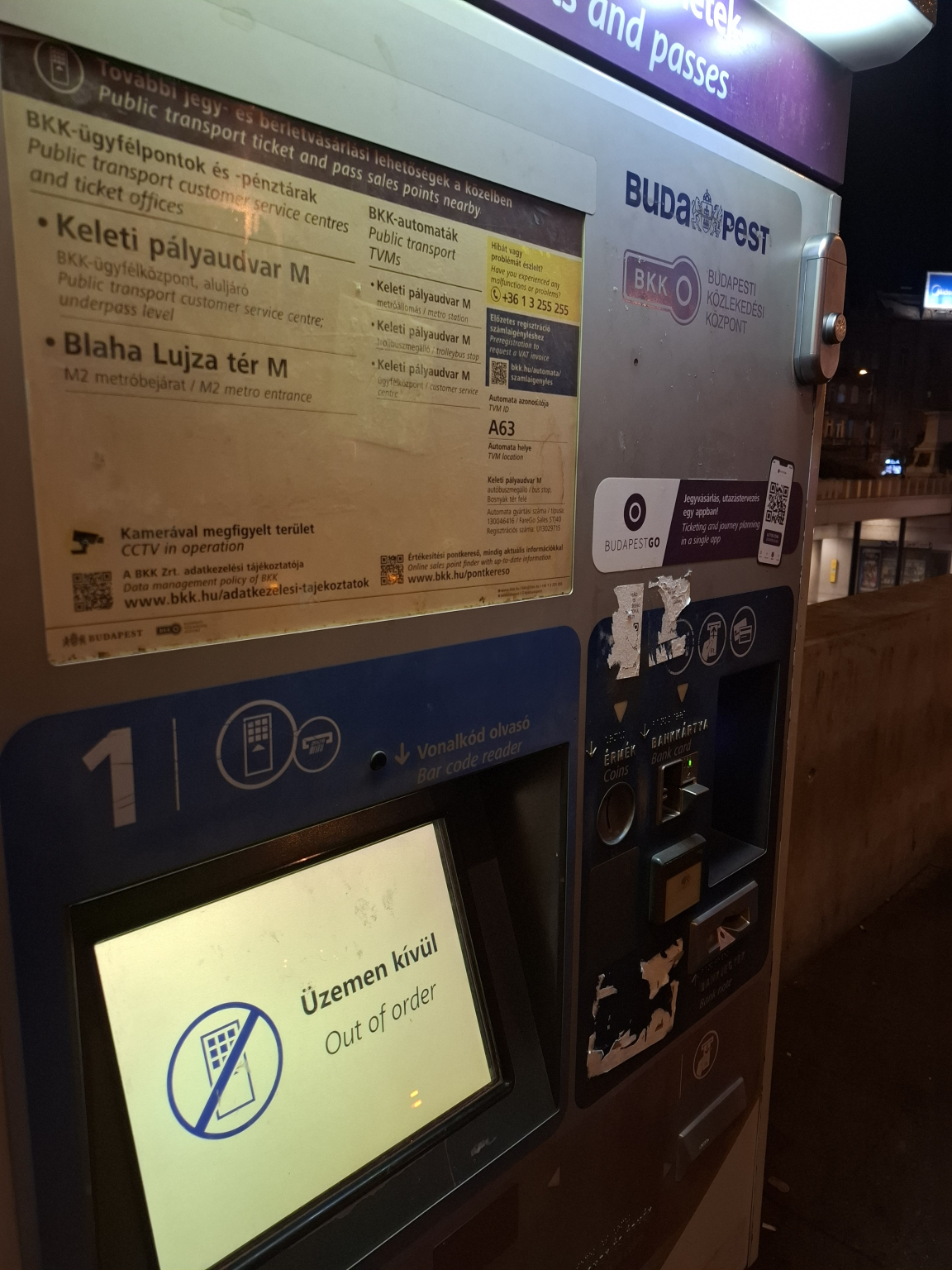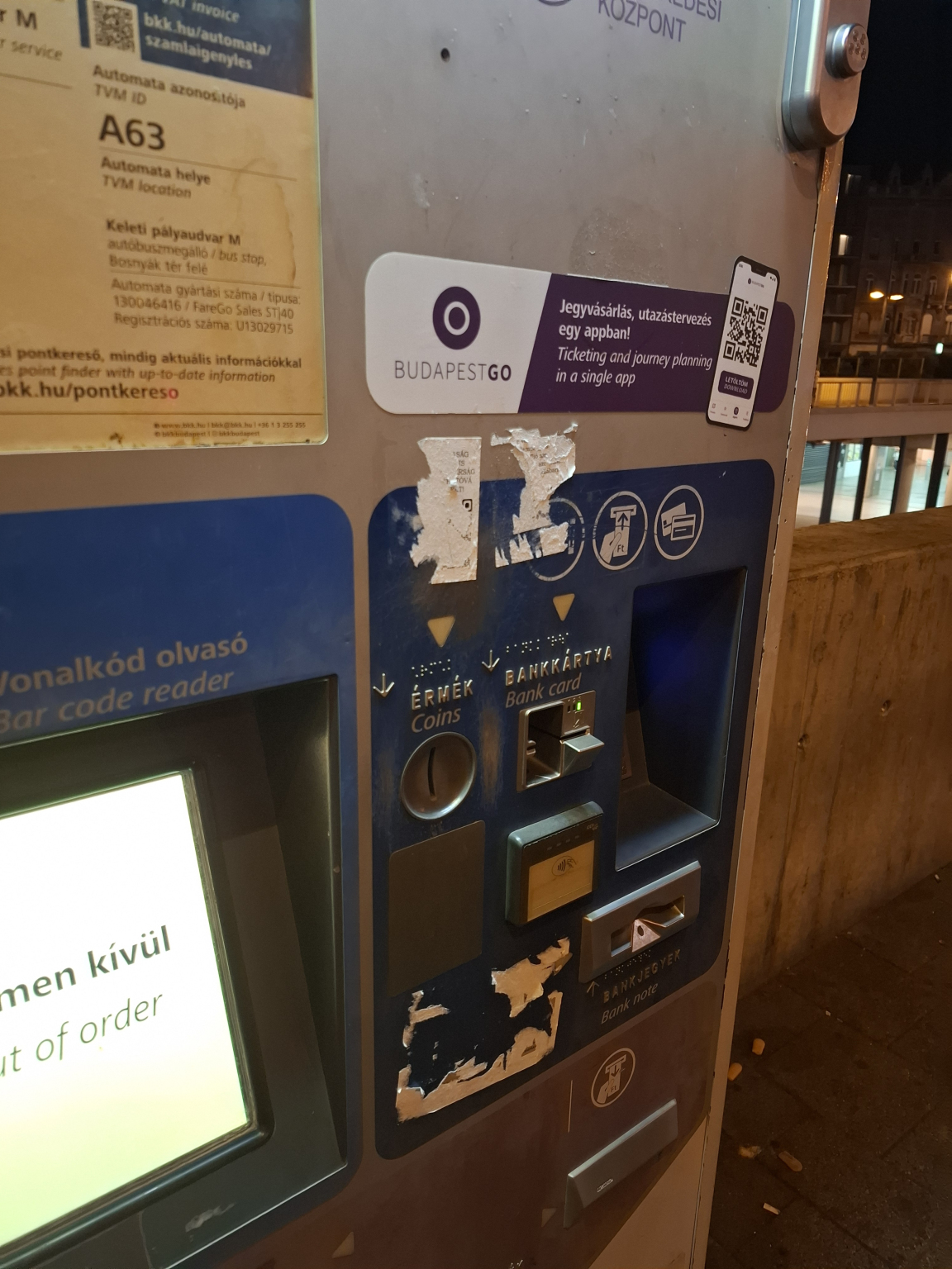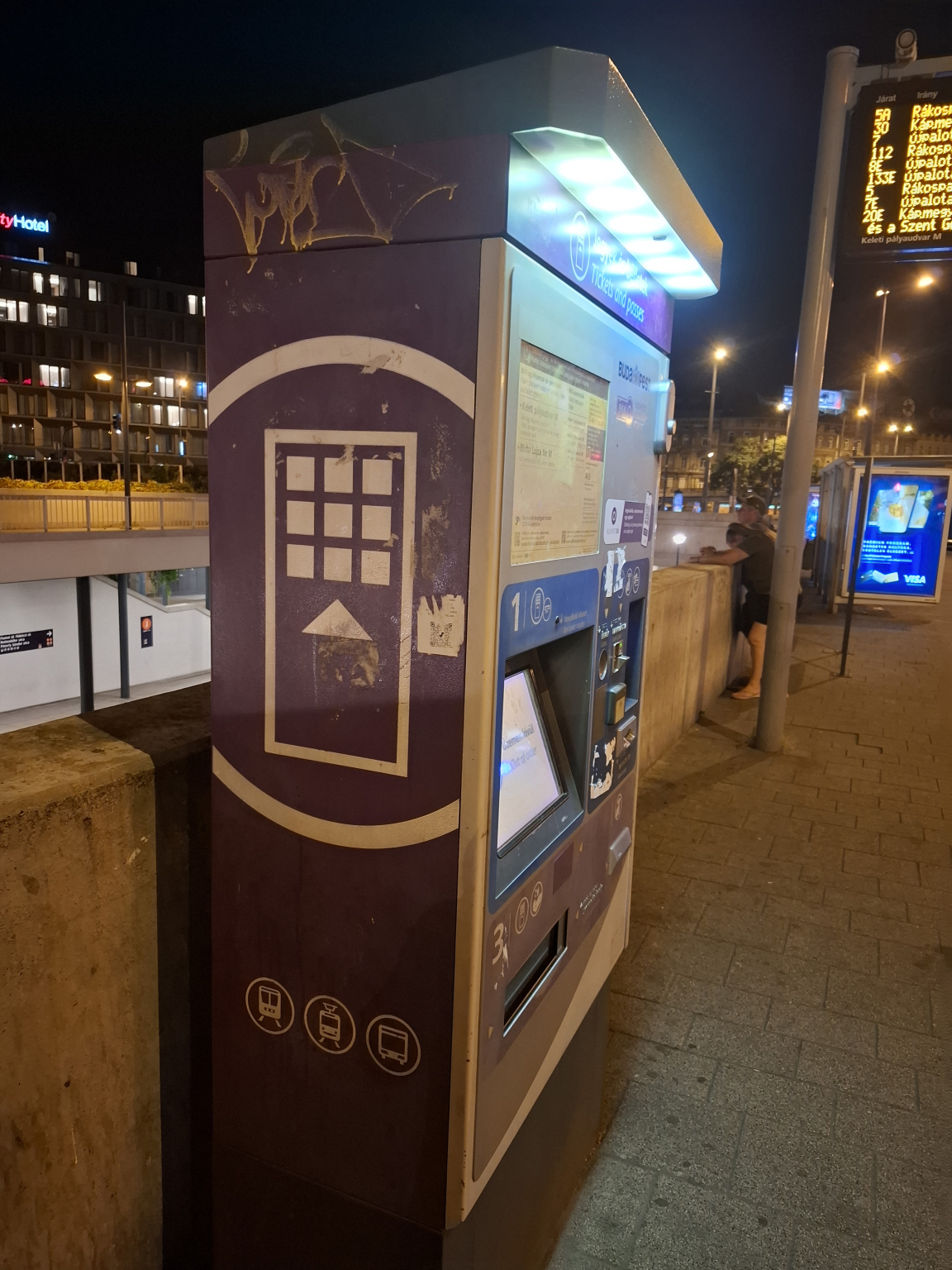 Keleti pályaudvar buszmegállóban az automata össze van firkálva, matricázva, ismeretlen eredetű QR kód van rajta, mellesleg nem is működik.