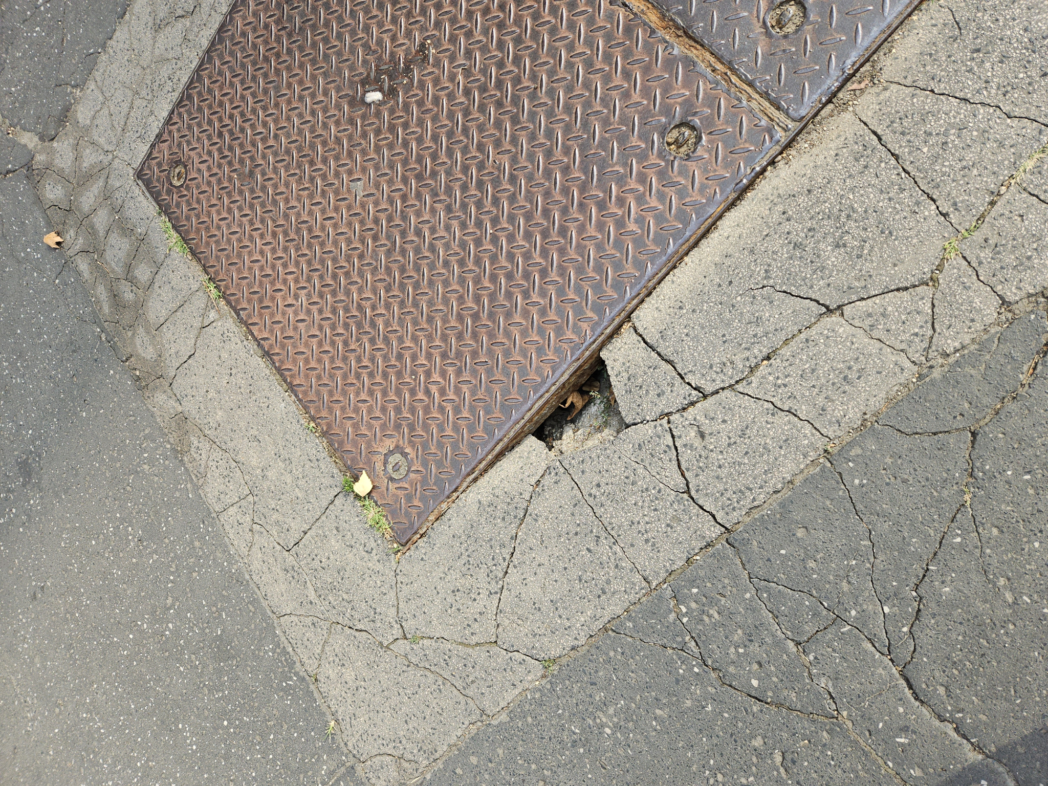 Ahogy a képen látható beszakadt a szerelőnyílás (vagy valamilyen csatornafedél) melett az aszfalt. A beszakadás közvetlenül a Tihany utca 15 sz. lépcsője elött van. Gyerekeknek balesetveszélyes, további beszakadása esetén meg az autóknak is azzá válik.