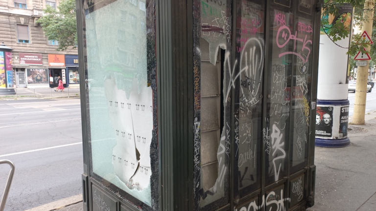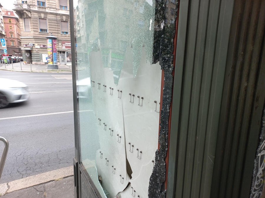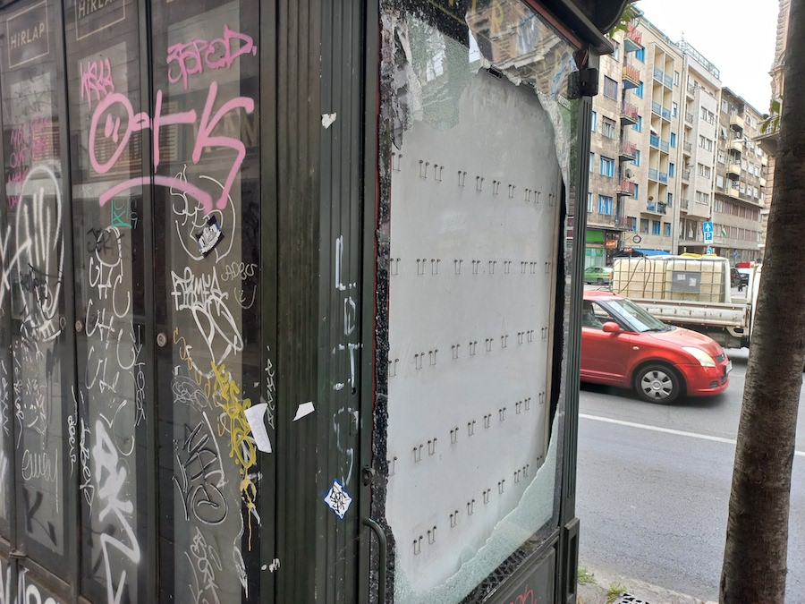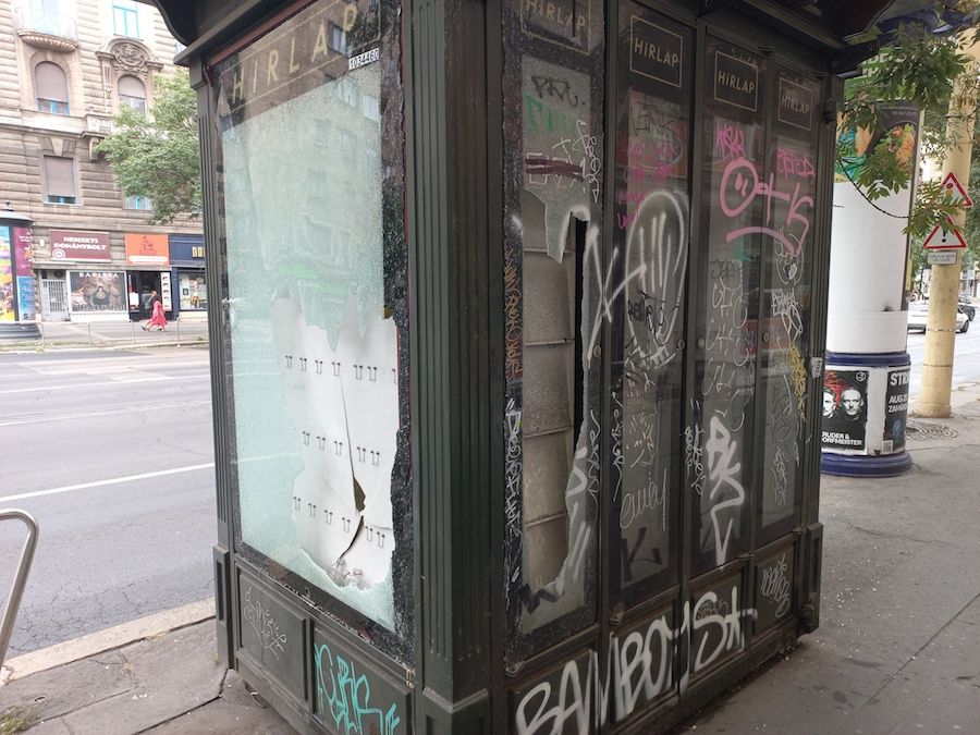 A Budapest VII. kerületében lévő Rákóczi ut 24.sz ház előtti hajdan ujságos-pavilon jelenleg üresen álló rozoga és elhanyagolt bódé hatalmas üvegeit mindkét oldalon és az elülső részen is alaposan szétverték, az üvegcserepek még láthatók de a hatalmas bármikor kieshető törött üvegtáblák még ott lógnak a keretekben, ami erősen életveszélyes az állapot, tekintve a nagy forgalmat, főleg a túristák tömegét ezen a helyen.