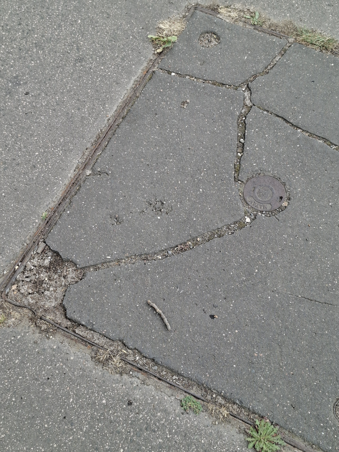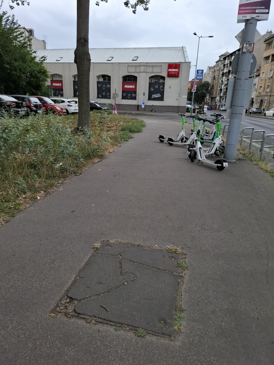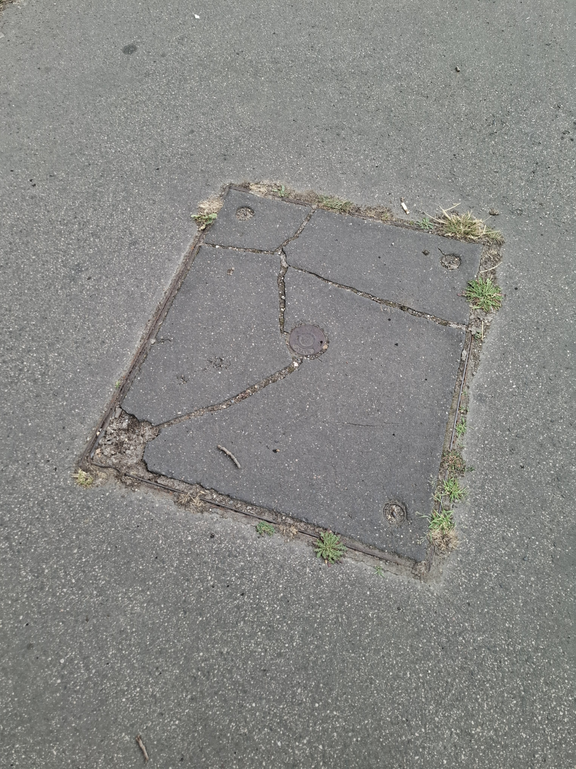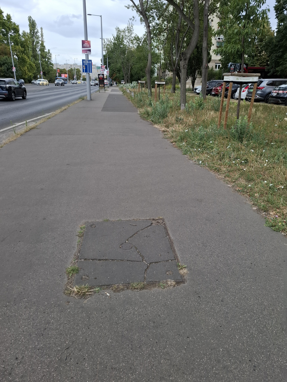A Pacsirtamező utca 45 előtt sérült a fedlap.