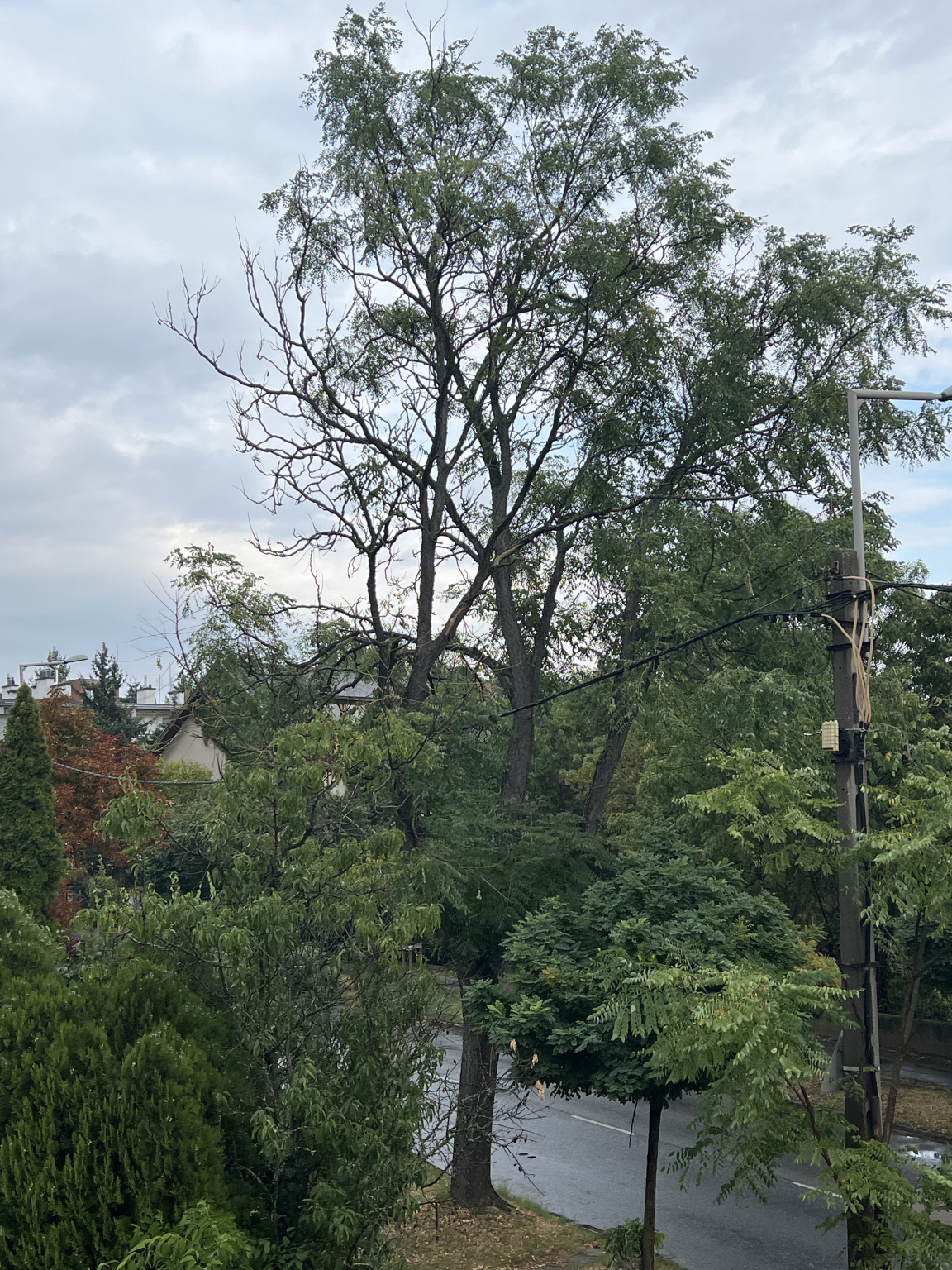 A Hegyalja út 131. számú ház előtti fa magyas, vastag oldalága teljesen elszáradt, előbb-utóbb egy vihar le fogja törni. Kimondottan veszélyesnek tűnik.