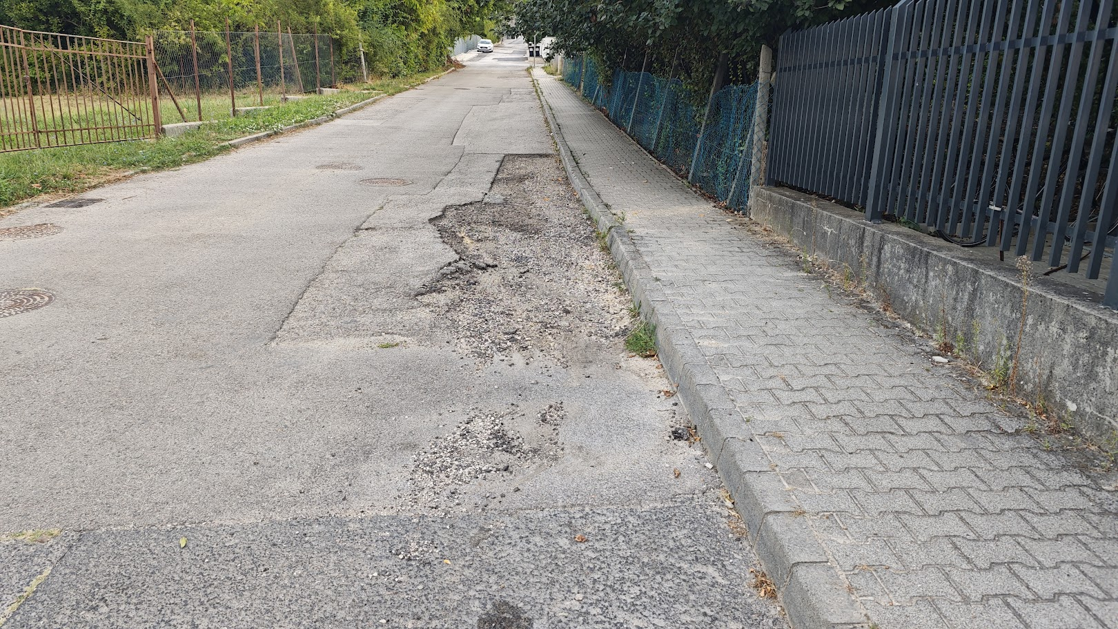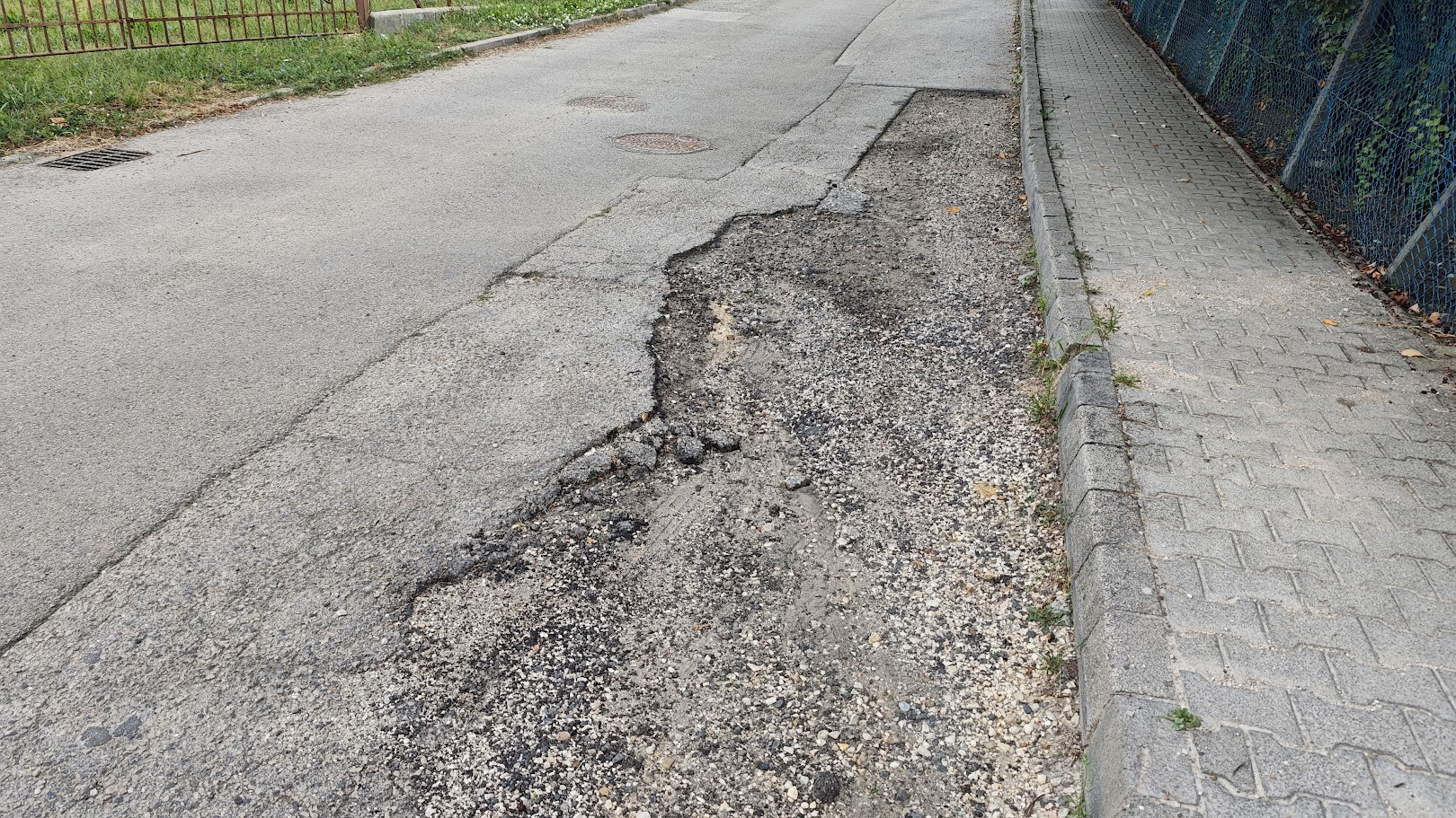 A Rétalja lejtó 1 előtt (alsó szakasz) évekkel ezelőtt javítottak valami közművet. A javítás fel van ugyan töltve, de nincs leaszfaltozva, ezért minden eső egyre több hordalékot mos ki a talajból. Napközben autók parkolnak itt, de attól még jól látható a probléma.