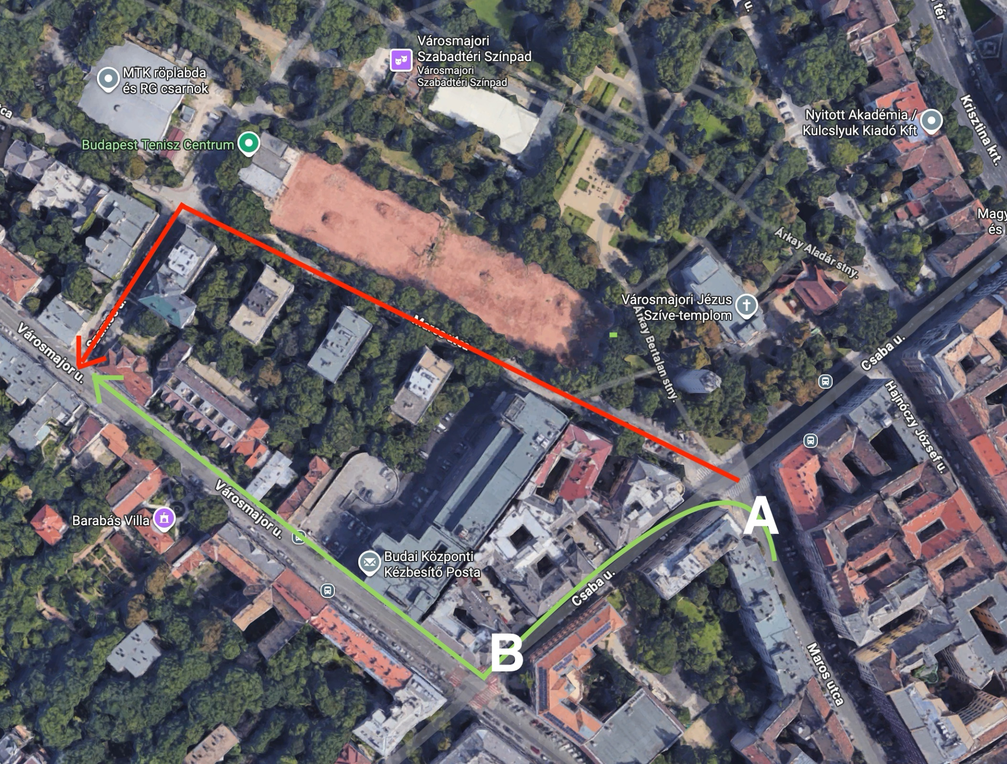 A Maros utca és a Csaba utca sarkán a Városmajori park felé haladó lámpa (A jelzés a térképen) nincs összehangolva a Csaba utca és a Városmajor utca lámpájával (B a térképen). Amikor zöldre vált "A" lámpa, akkor utána rövidesen pirosra vált a "B" lámpa. Ráadásul "B" lámpa indokolatlanul hosszú ideig piros (jobbkanyarodáshoz akár lehetne külön zöld jelzése, mert nem zavarná a forgalmat). Ezért a Maros utca felől a János kórház felé tartó autósok inkább azt választják, hogy továbbhaladnak a Maros utcán a 30-as övezeten keresztül a Szamos utcán át a Városmajor utcába, mert ezen a úton nincs lámpa (pirossal jelölt útvonal a térképen). Ahelyett, hogy a Csaba-Városmajor vonalon haladnának normálisan (zöld útvonal), nem terhelve a kis mellékutcát. Ráadásul a Maros Városmajori park mellett futó része inkább már sétáló övezet jellegű, ahol babakocsikat tolnak az anyukák, a piacról sétálnak haza a nagymamák a kis húzós kocsijaikkal, akiket a rendszeres gyorshajtók állandóan veszélyeztetnek. Mert persze így senki nem tartja be a 30-as korlátot, hiszen pont a rövidítés miatt mennek arra az autósok. És persze így rendkívül rossz is már az útburkolat ebben a kis mellékutcában.