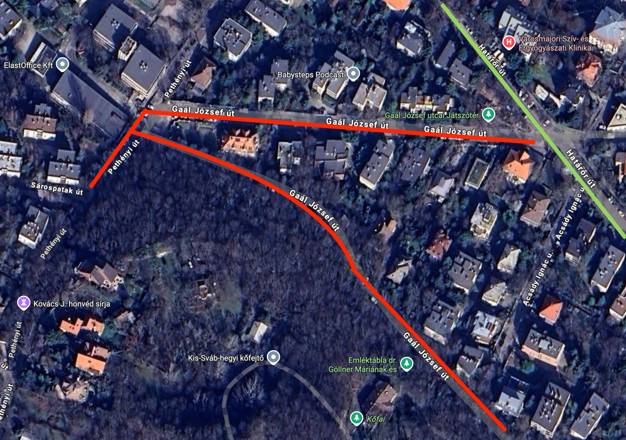 A Gaál József út Pehényi úthoz közel eső szakaszát (pirossal jelölve) az ingázók "P+R" parkolónak használják a hétköznapokon. A fizető övezet határa a Határőr úton van (zölddel jelölve). Ez több okból is problémás. Egyrészt ezek az utcák már eleve nagyon szűkek, csak egy irányban járhatóak, a másik felüket a parkoló autók foglalják el. Így amikor zsúfolásig tele van az utca parkoló autókkal, akkor nagyon nehéz olyan pontot találni, ahová beállva szabályosan el lehetne engedni a szembejövőt. Másrészt vannak olyan napok, amikor a kukásautók délelőtt dolgoznak ezekben az utcában, és így óriási torlódást okoznak, mert megkerülhetetlenné válnak a sok parkoló autó miatt. Végül pedig igazából a Kissvábhegyi természetvédelmi terület tövében állnak meg csomóan, ráparkolva a növényzetre, tönkretéve a nem erre kiépített útburkolat szélét és egyre kimélyítve a talajt. Több megoldás is sokat segítene a helyzeten: a leghatékonyabb lenne a piros útszakaszt is belevenni a fizető övezetbe, ami egy csapásra megoldaná az egész kérdést, de már az is hasznos lenne, ha csak az erdő tövében meg lenne tiltva a parkolás. Ez aránylag kevés helyi lakost érintene, de rengeteg ingázót vezetne szabályos parkolásra és minden autóval közlekedőnek felszabadítaná az útját.