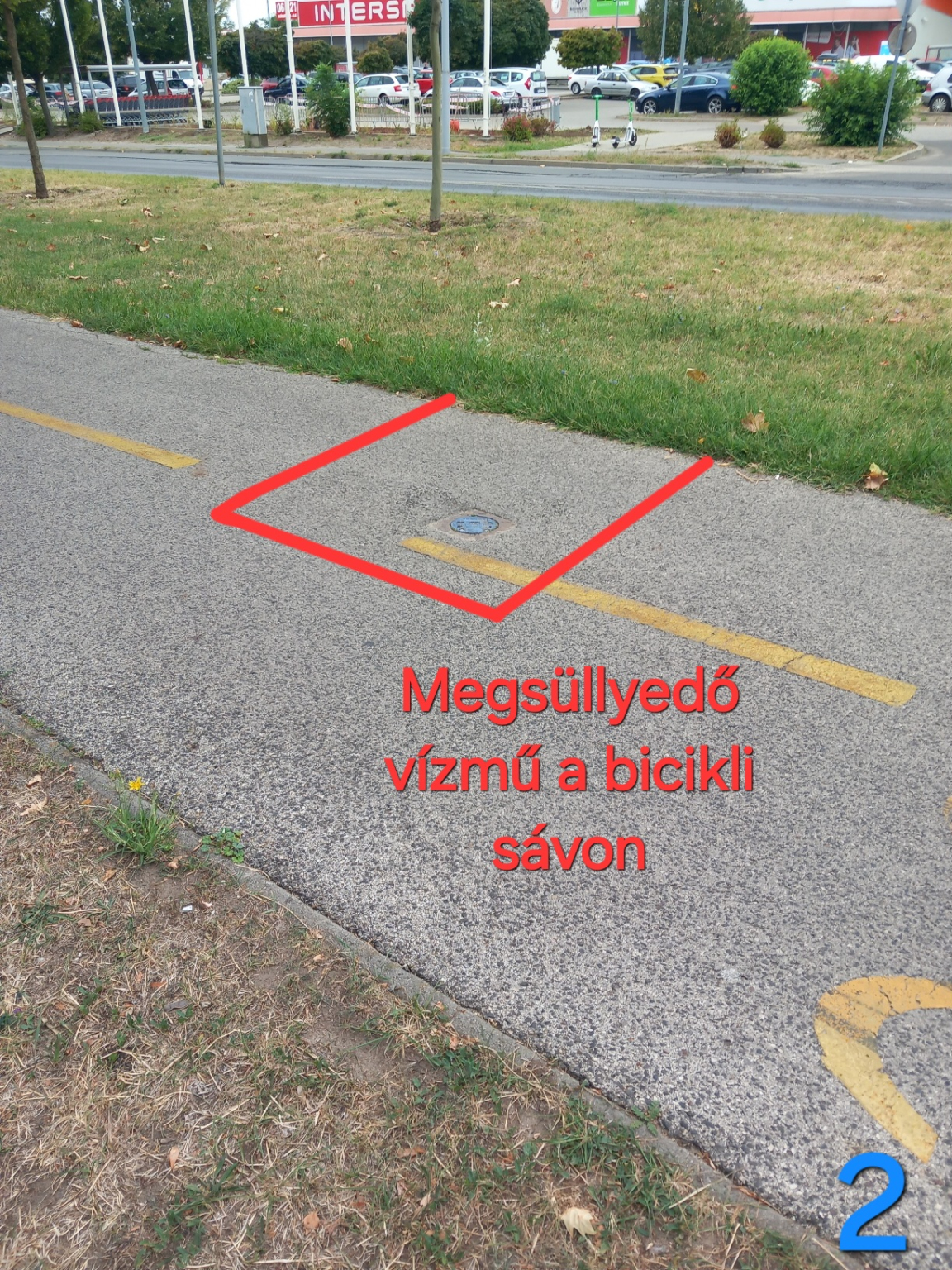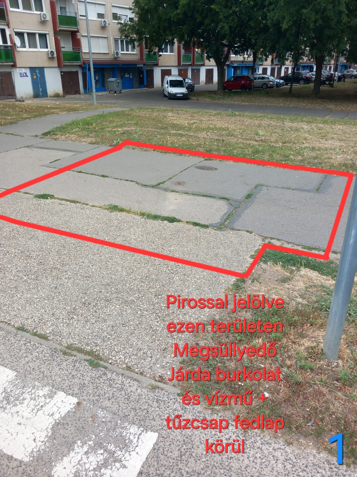 Értesítem hogy az első oldalon, pirossal jelölve ezen területen a járdaburkolat + vízmű fedlap és tűzcsap fedlap körül járdaburkolat megsüllyedés látható, illetve második oldalon a Sibrik Miklós úton bicikli úti sávon pirossal jelölve a vízmű fedlap lassan megsüllyed a bicikli útburkolat sávnak helyéről, akár rosszabá válhat