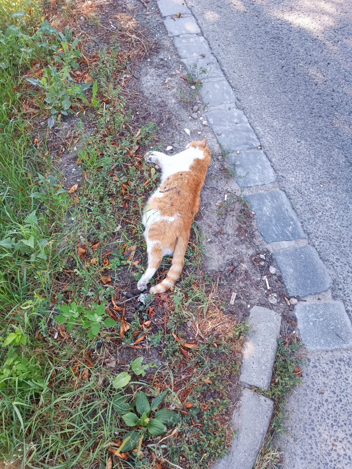 Elgázolt macska fekszik a Hidegkúti út és Csokonai utca sarkán (Hidegkúti út 148. előtt).