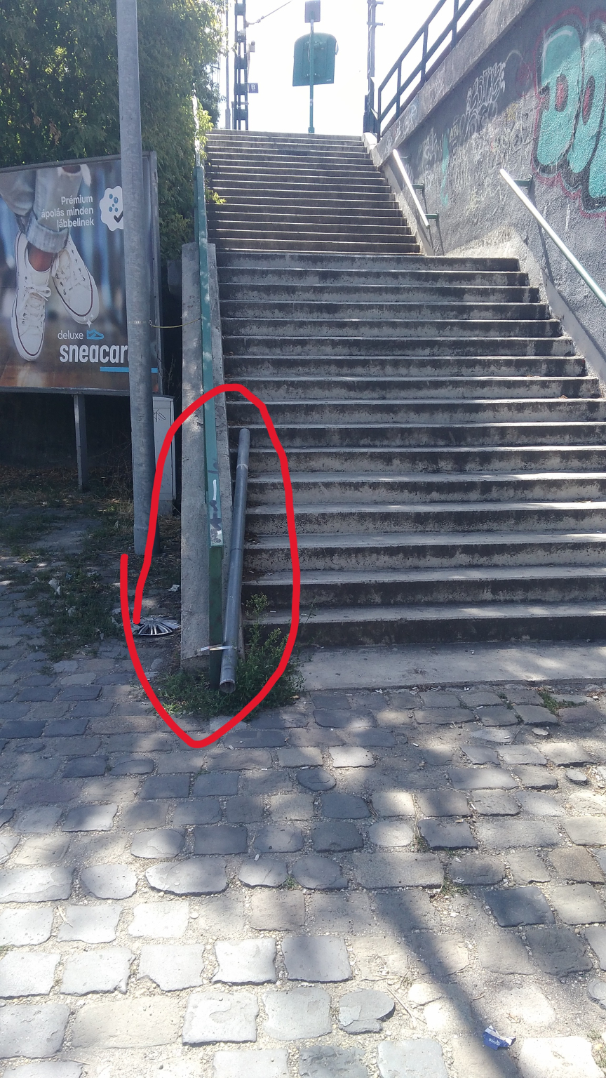 Kérem az illetékest, hogy a képen látható, félredobott oszlopot helyezze vissza a helyére, vagy szállítsa el!