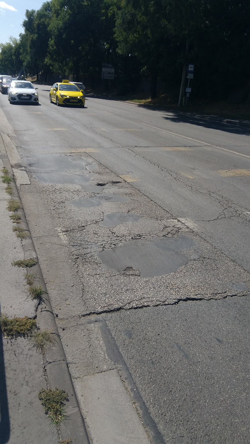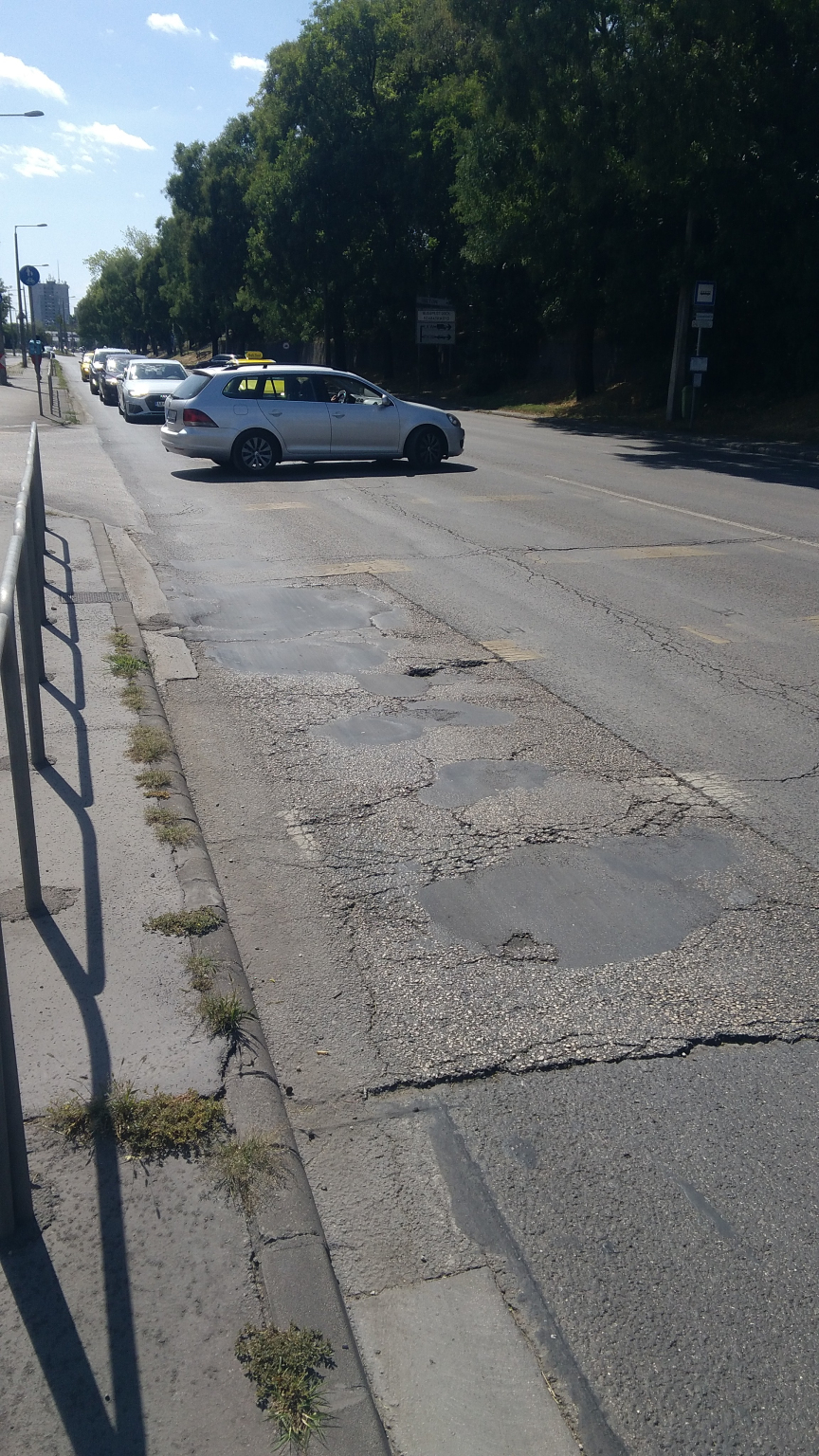 Kérem az illetékest, hogy a jelzőlámpa előtti útszakaszt legyen szíves újraburkolni!