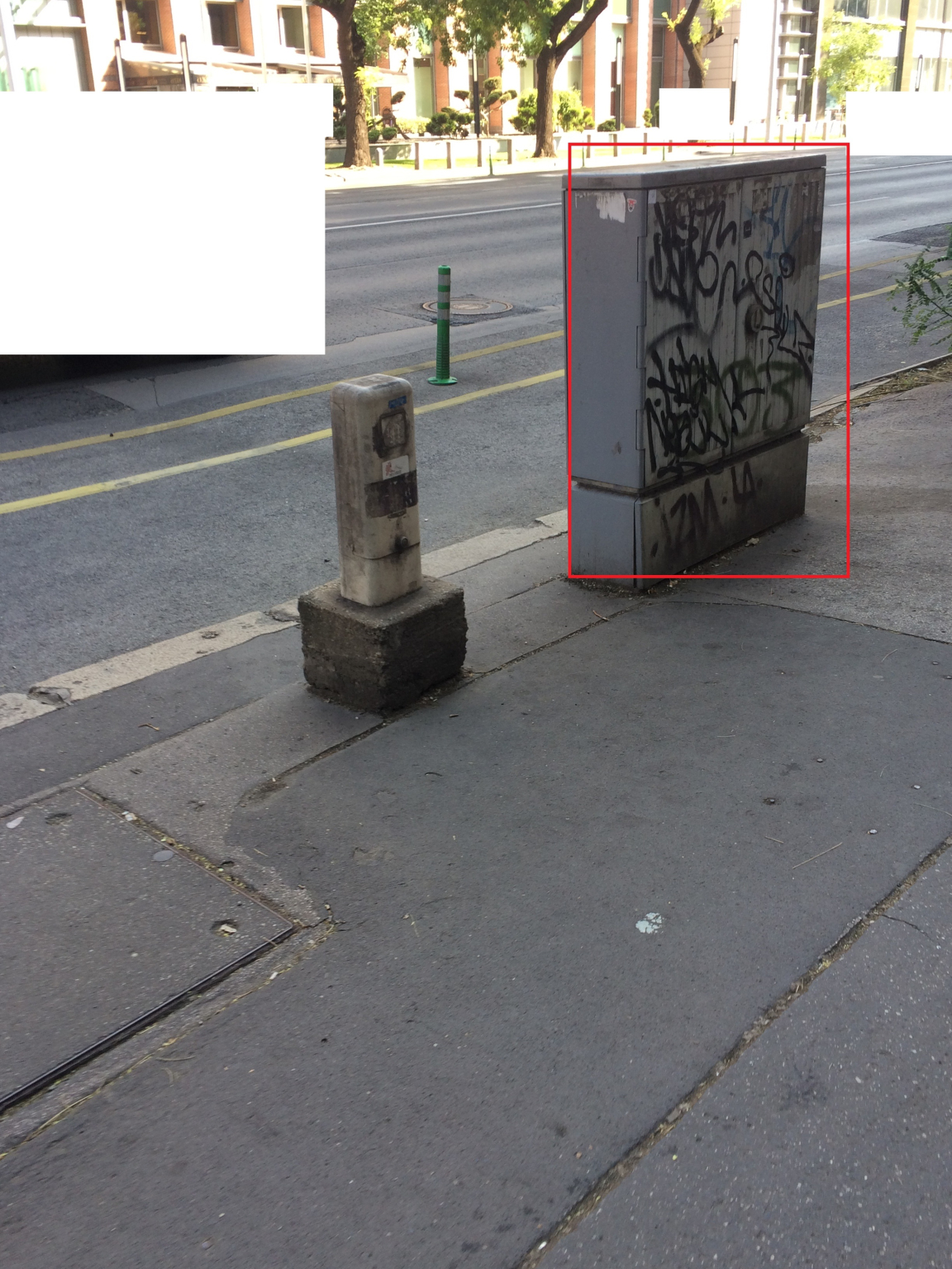Jelzett helyszínen lévő szekrény firkás, rongált, graffitis, borzasztóan lehangoló látvány.