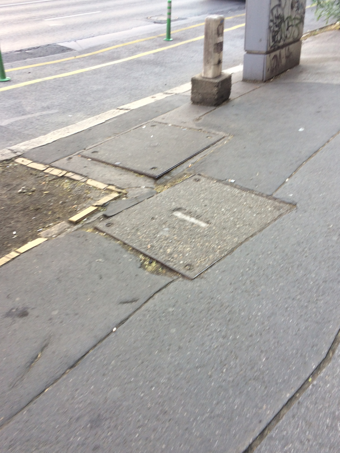 Jelzett helyszínen lévő fedlapok egyenetlenek a járda síkjához képest, ami botlásveszélyes, és a látványa se túl jó.