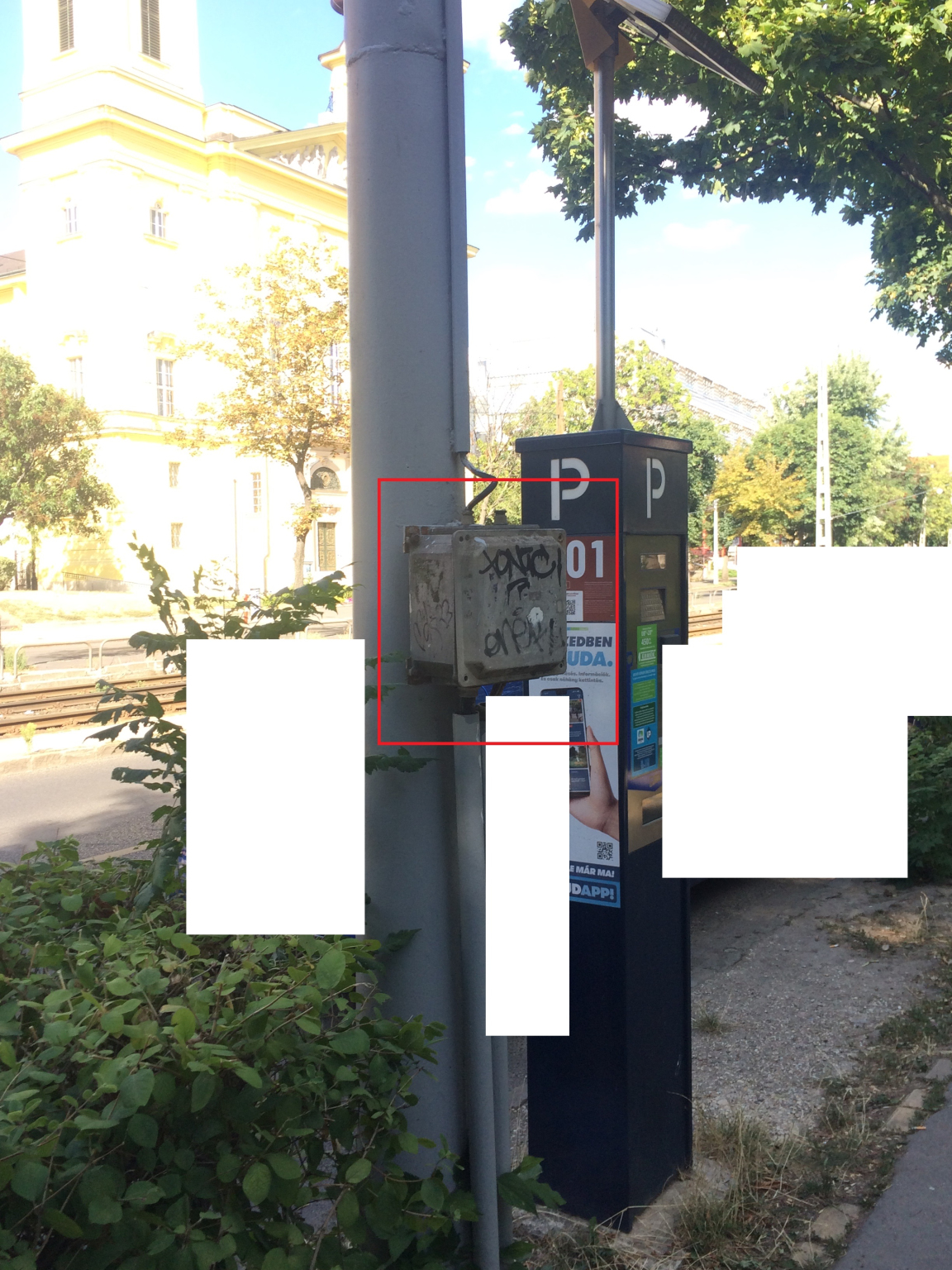 Jelzett helyszínen lévő doboz firkás, rongált, graffitis.