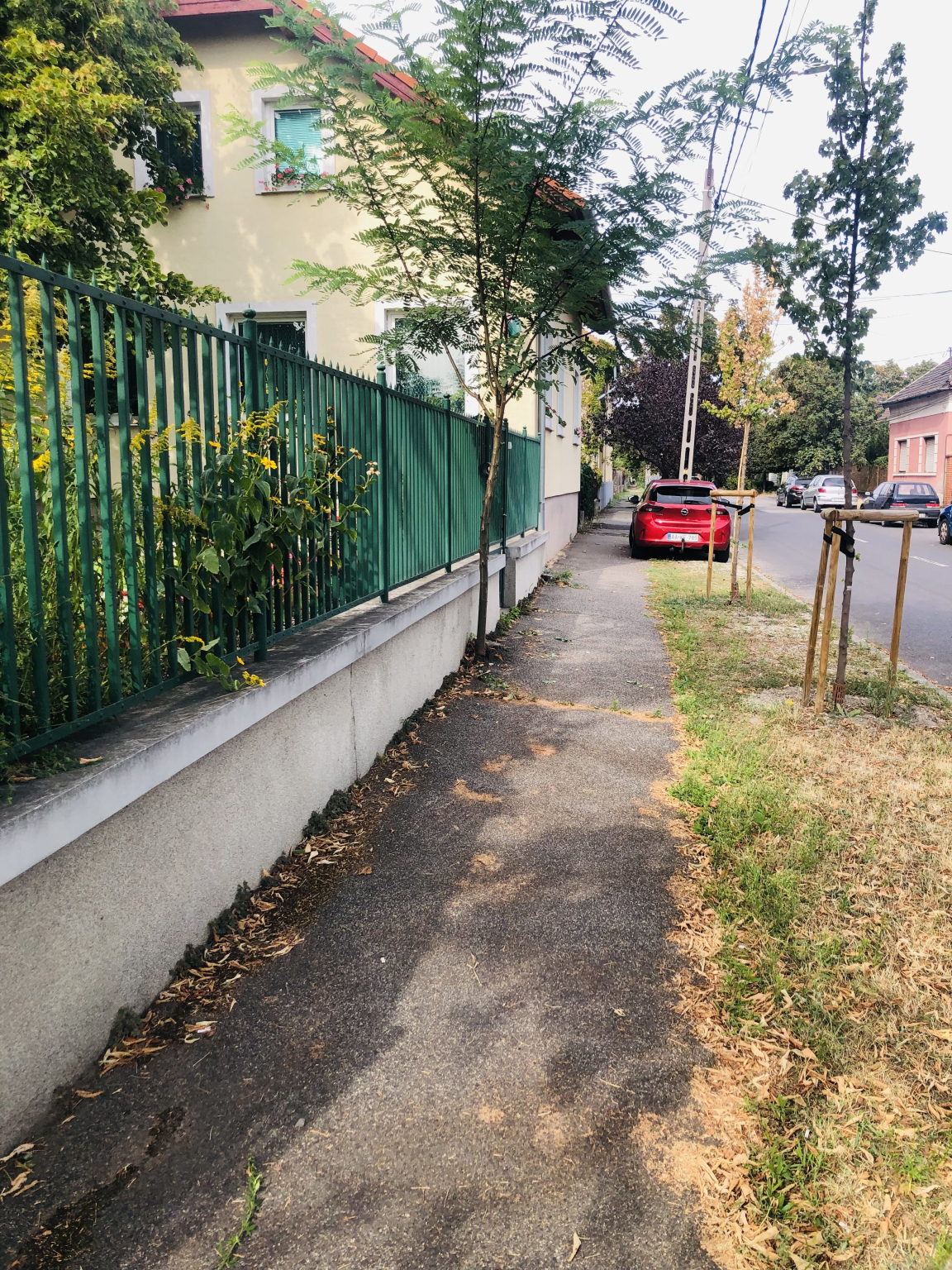 A kerítés és a járdaburkolatt között nőtt egy bálványfa. Kérem, irtsák ki, mielőtt tönkreteszi a járda aszfaltját.