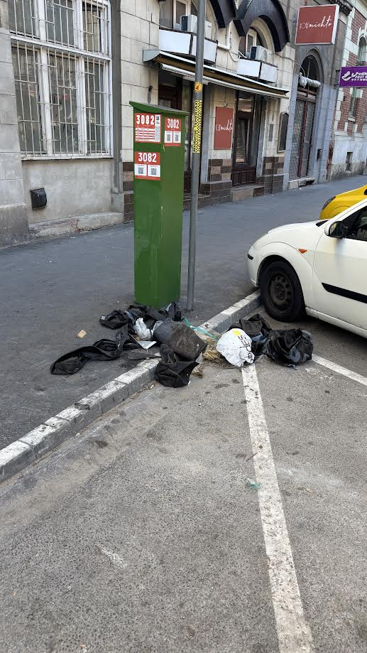 A Kiss József u. 4. előtt a parkolóautómata körül a járdán és az úttest szélén szemét van szétszórva. Kérem a tisztelt illetékeseket, legyenek szívesek eltakarítani azt!