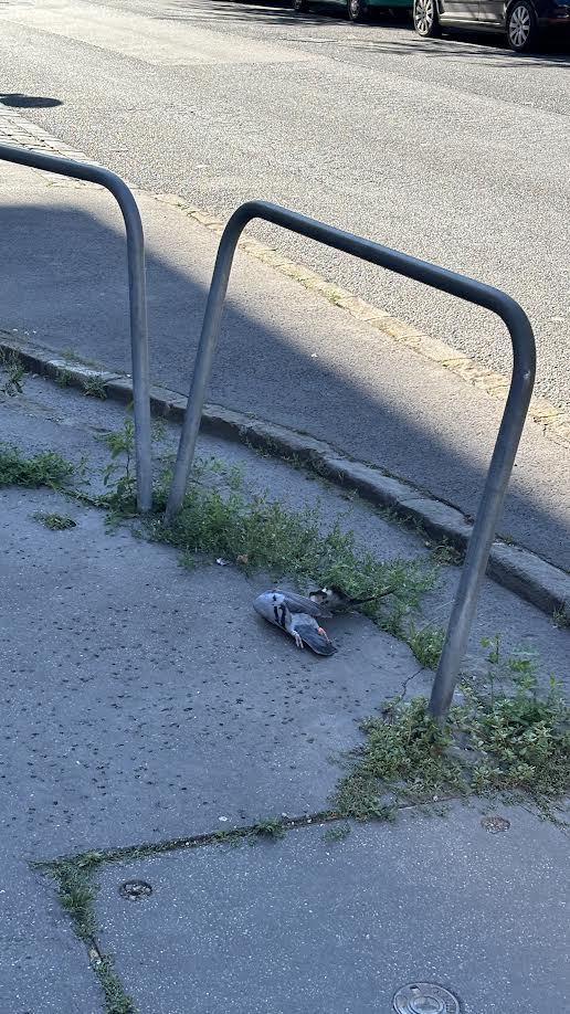 A Mátyás tér 7-8. előtt egy elhalálozott galamb teteme hever a korlát alatt. Legyenek szívesek eltávolítani!