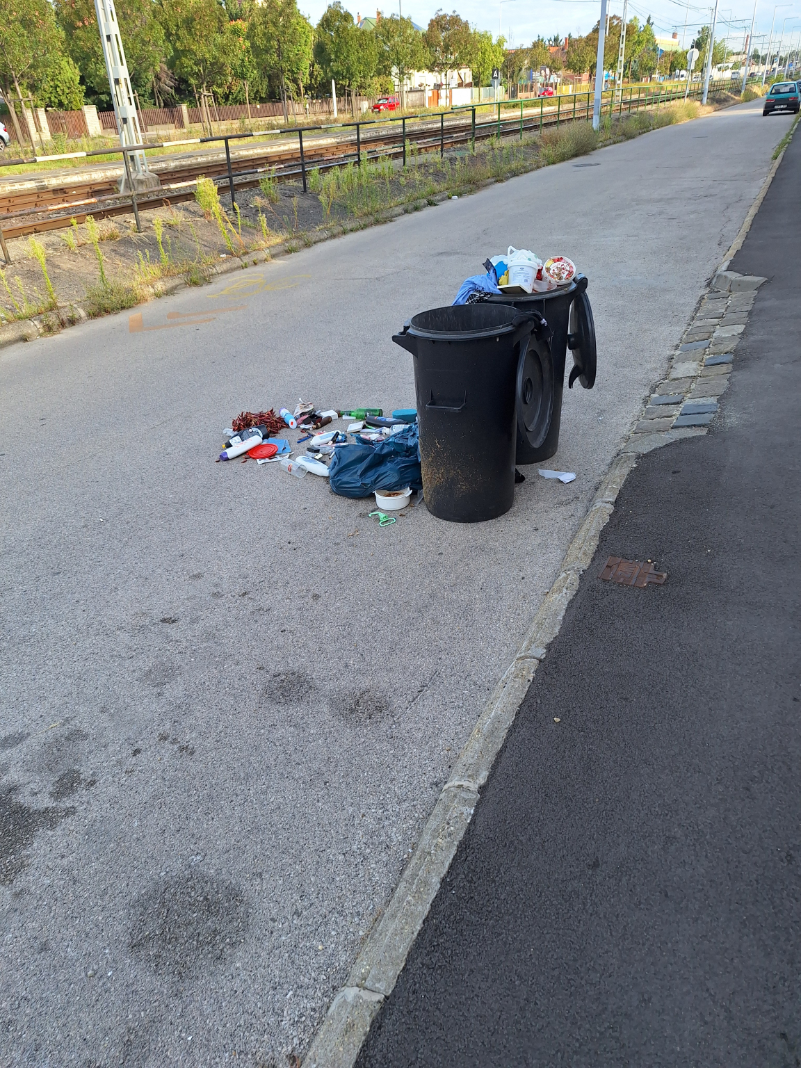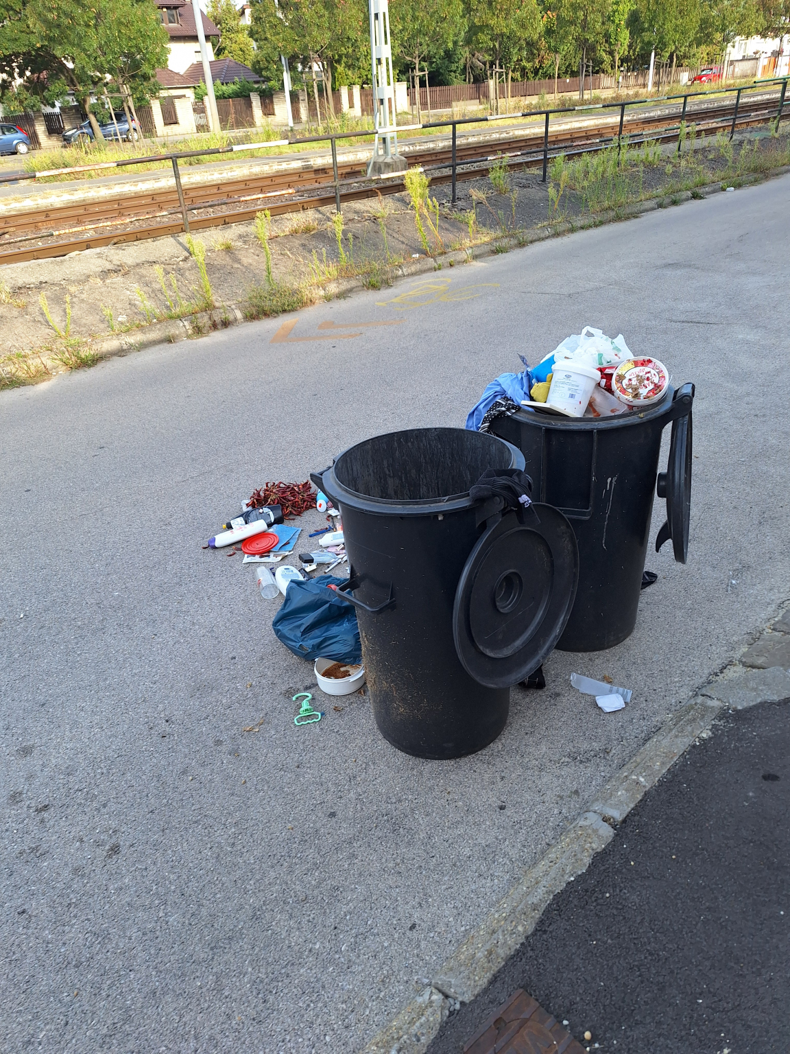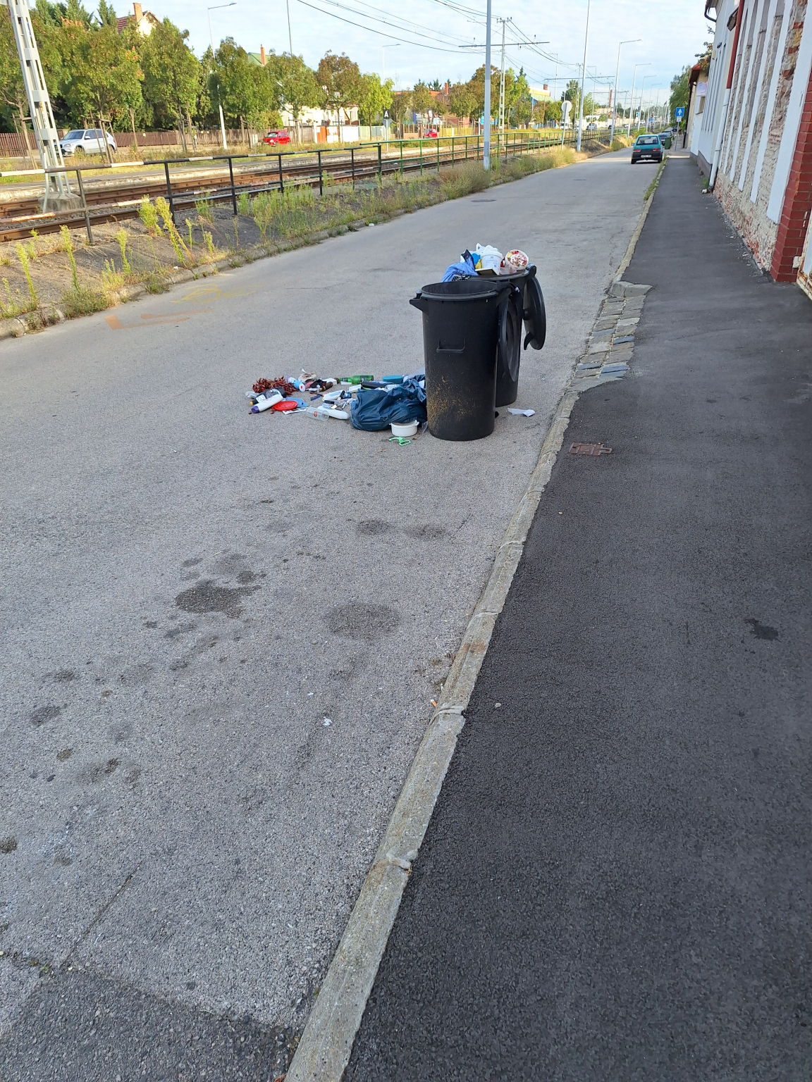 Rendszeresen turkálnak a kukákban a visszaváltható palackok miatt. Nem tudom, hogy az FKF dolgozóinak feladköre-e, hogy eltakítsa ez a piszkot. Abban viszont biztos vagyok, hogy legalább a Rendészet tehetne ellene, ha már kamera által jól látható helyen van.