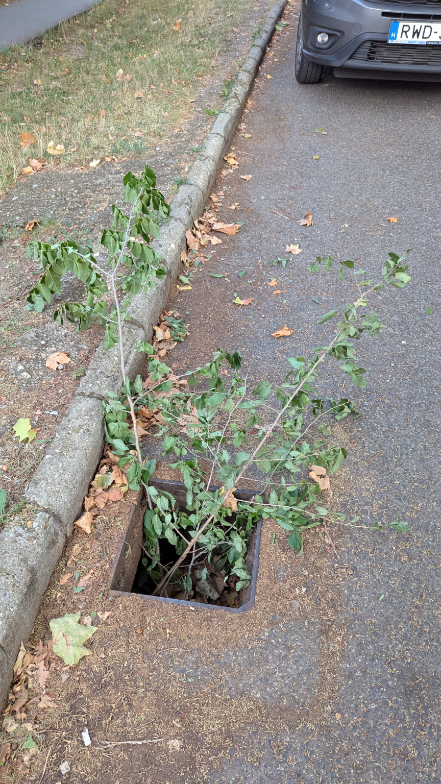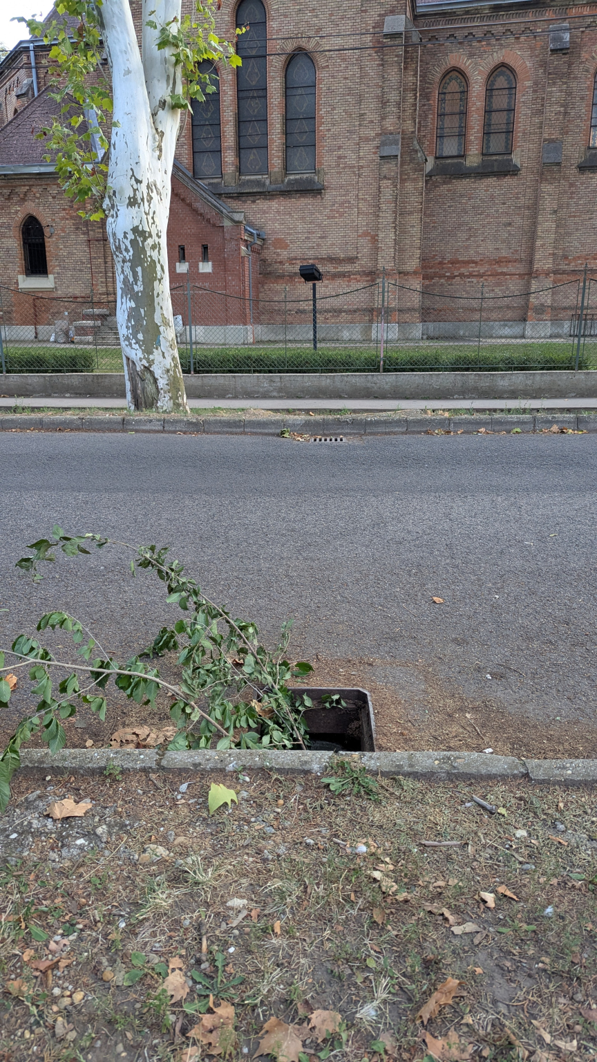 A prodám utcában eltűnt az egyik szikkasztót fedő rács, amely így rendkívül balesetveszélyessé vált. Ezt elkerülendő az itt lakók ágakat dugtak a lyukba.