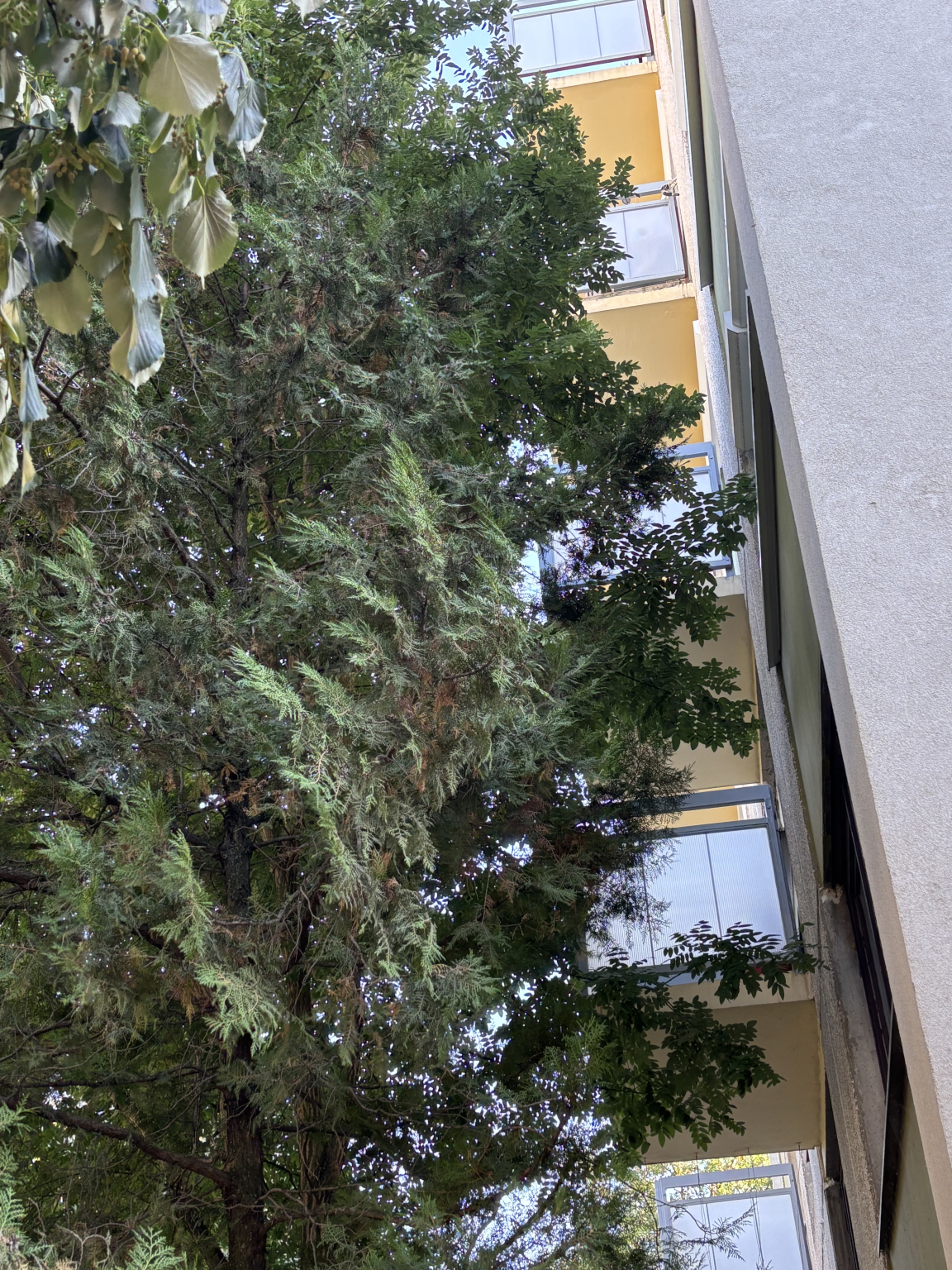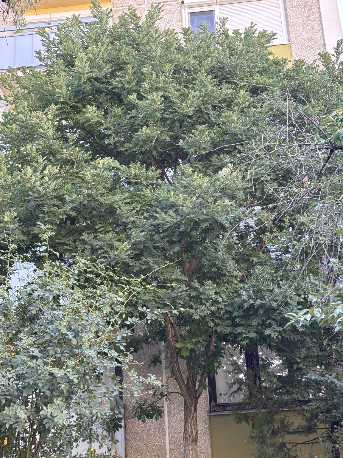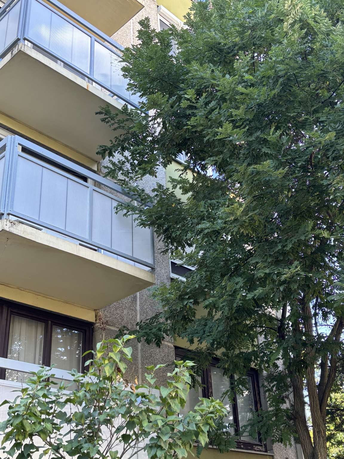 1165,Budapest Orsika tér 1. Park felöli ház oldalra rá nőtt az akácfa és egy tuja ezzel elvéve a lakóktól a napfényt . A fákról rengeteg száraz levél ,fa ág potyog az erkélyekre .