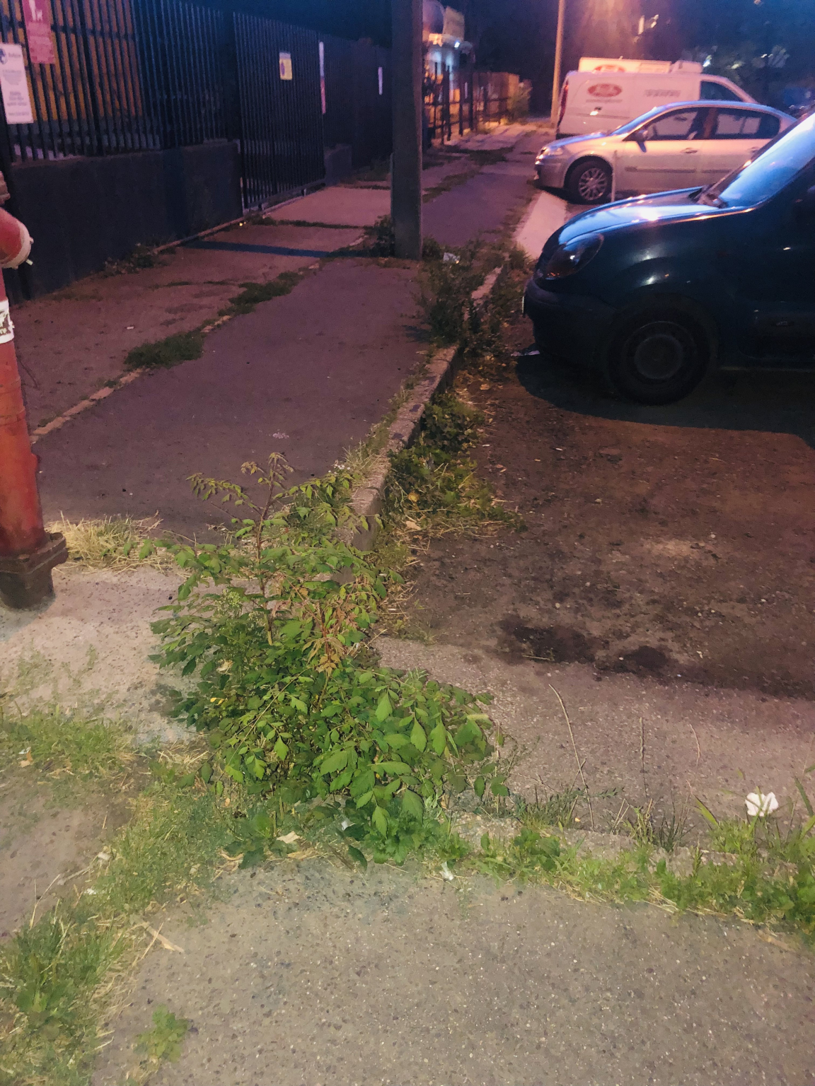 A járdaszegély és az úttest aszfaltja között bokorszerű gaz nőtt a parkoló sarkában és onnan nézve még egy kis szakaszon. Legyenek szívesek, irtsák ki ezeket.