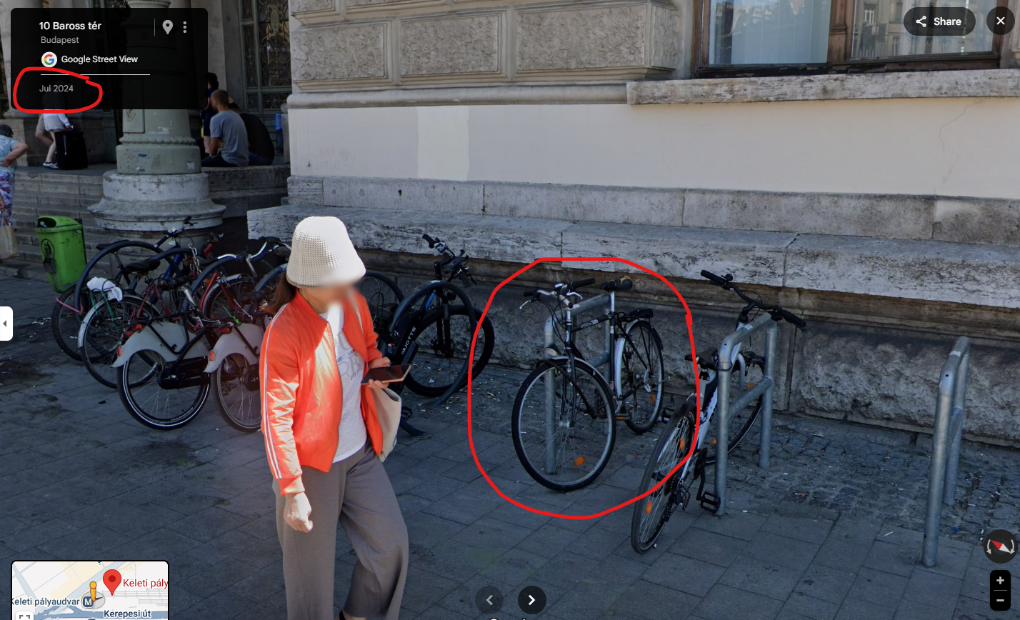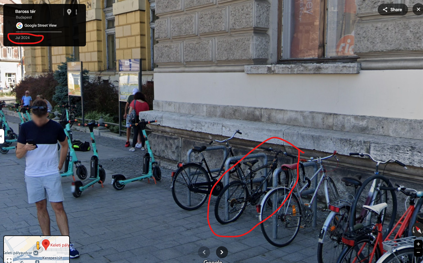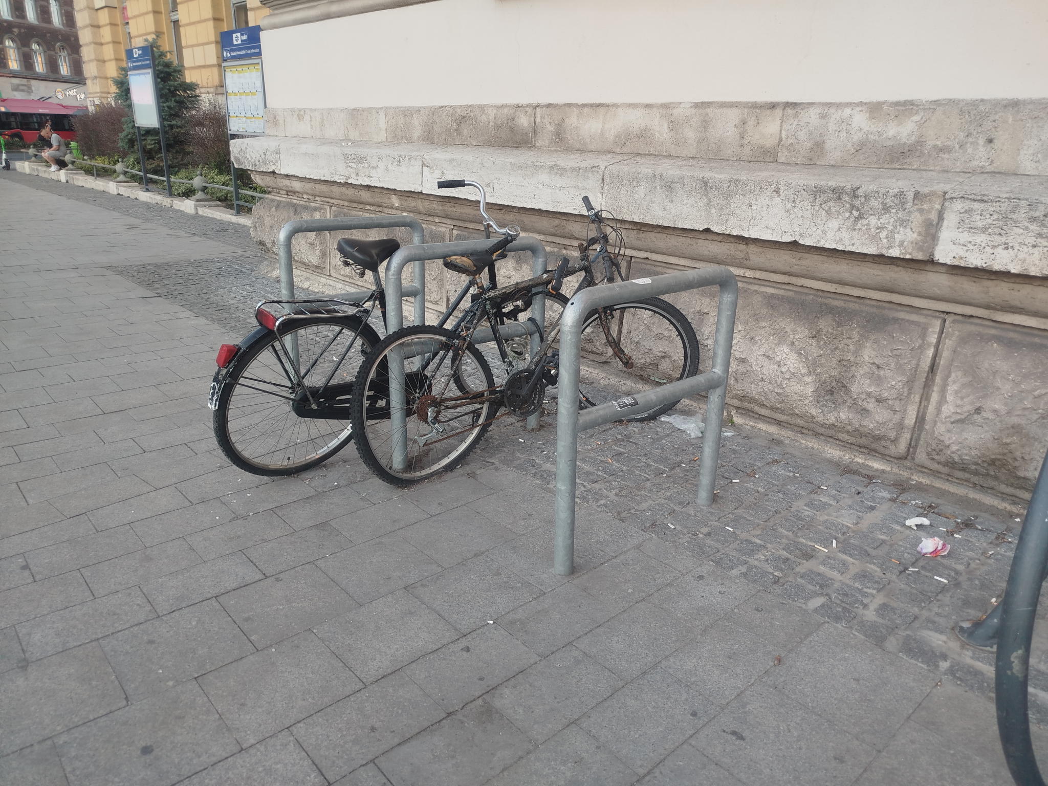 A Keleti pályaudvar előtti tárolókban régóta ott található ez a 3 kerékpár. Defektes, rozsdás, hiányos, sérült mindegyik. Kérjük eltávolítani.