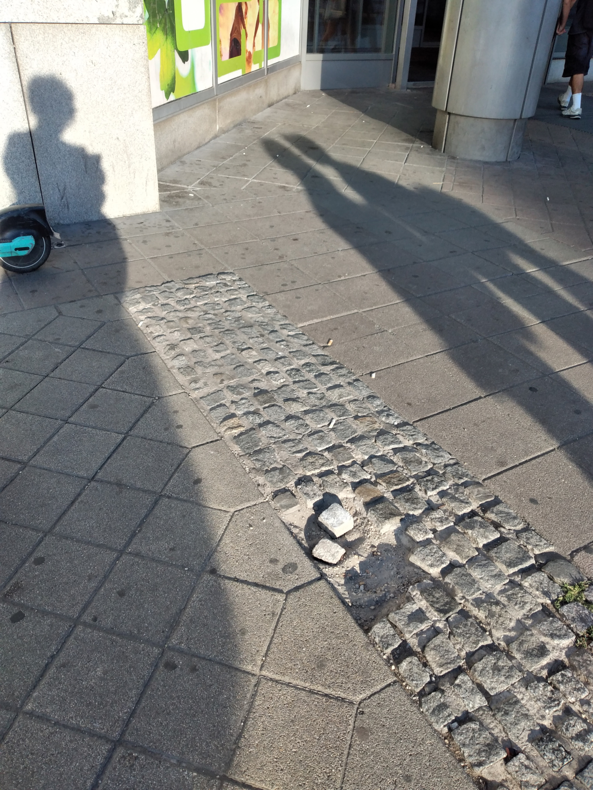 Az Árkád bejárata előtti járdán a kis kövekből kiraakott részen hiányzik több kő, néhány pedig kimozdult már a helyéről. Elég mély lett a gödör, kerékpárosra, gyalogosra egyaránt veszélyes, kérem szépen javítani.