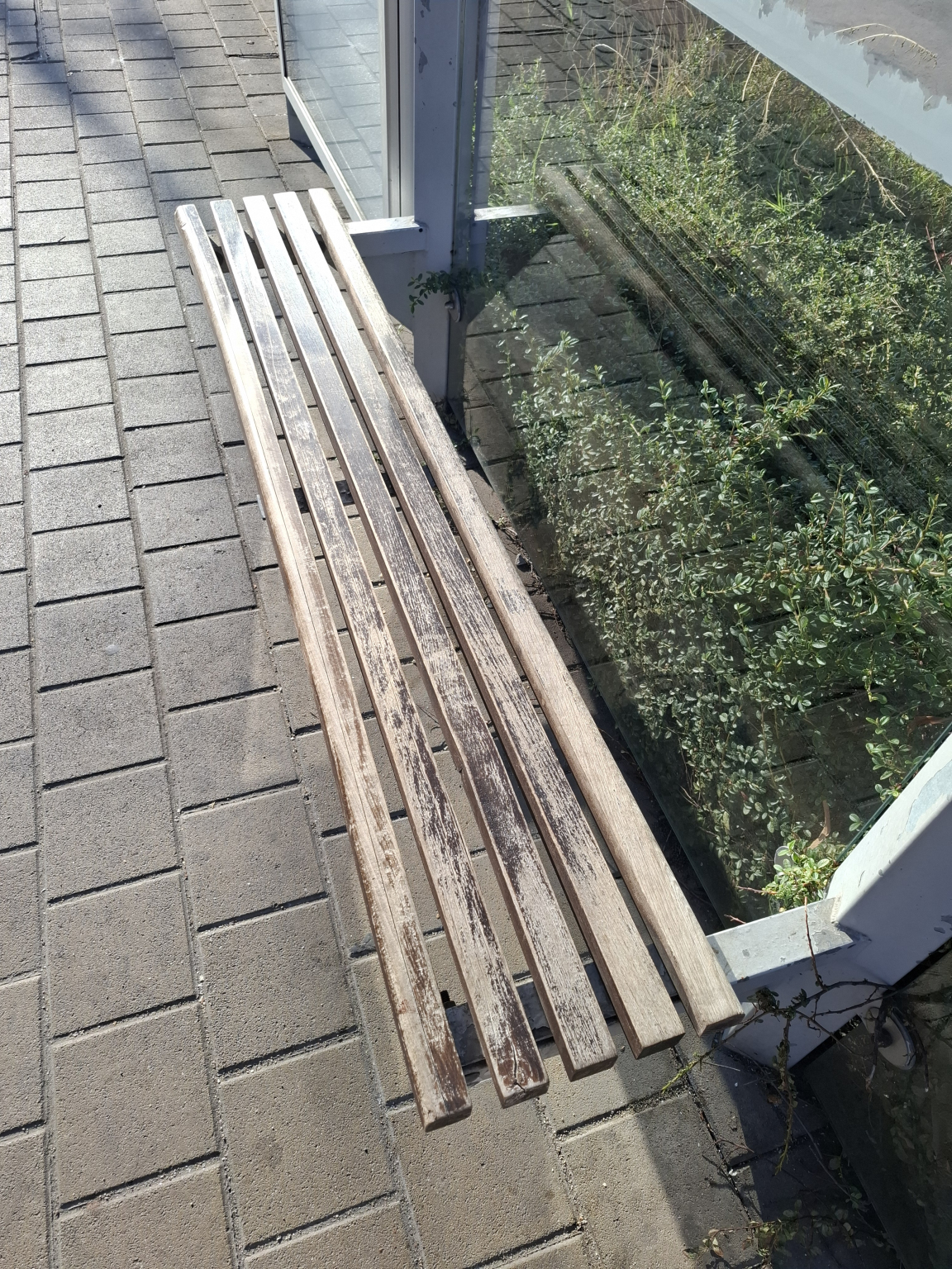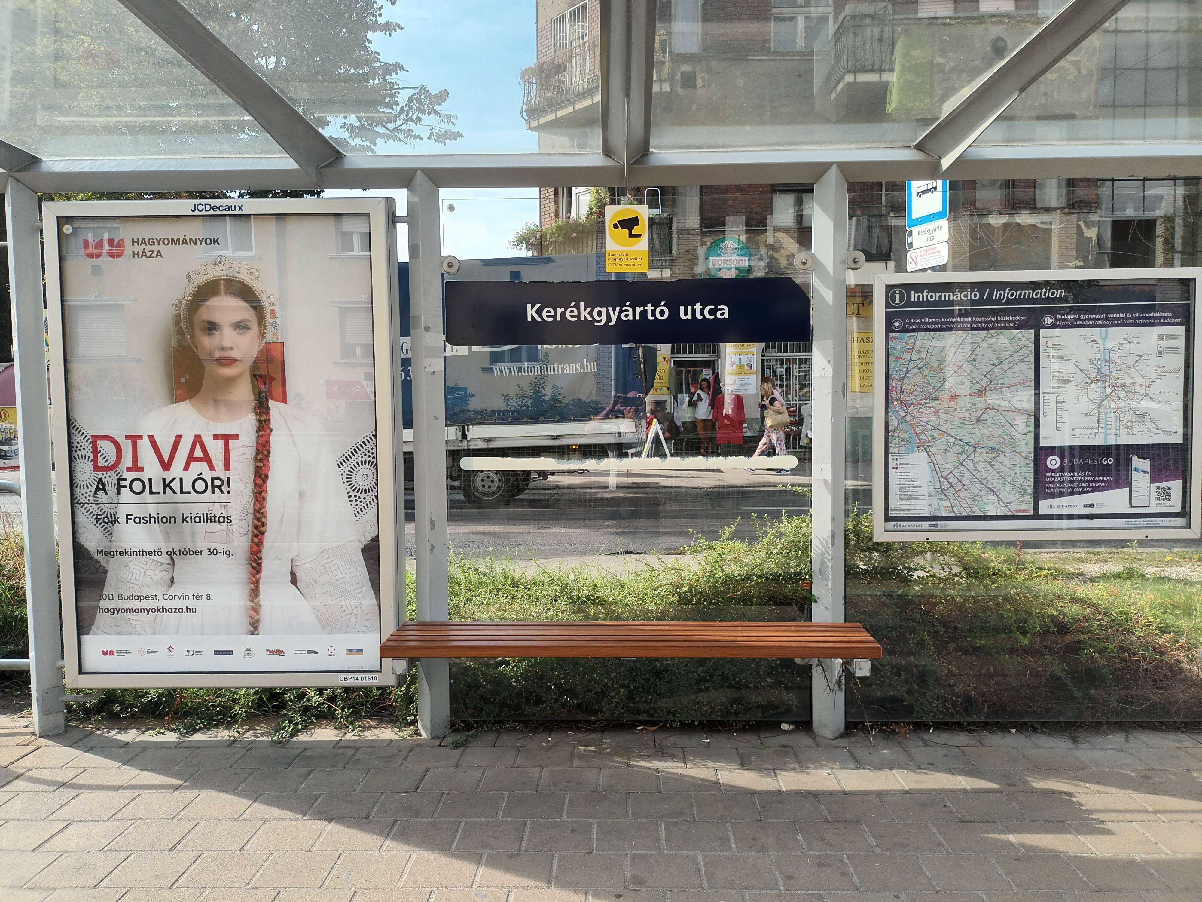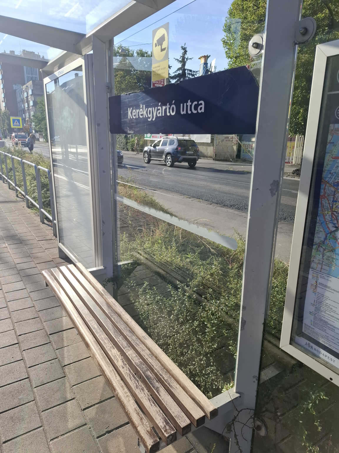 A Kerékgyártó utcai villamosmegállóban (a Postával szemben) lekopott a padról a festés, az egyik léc elgörbült.