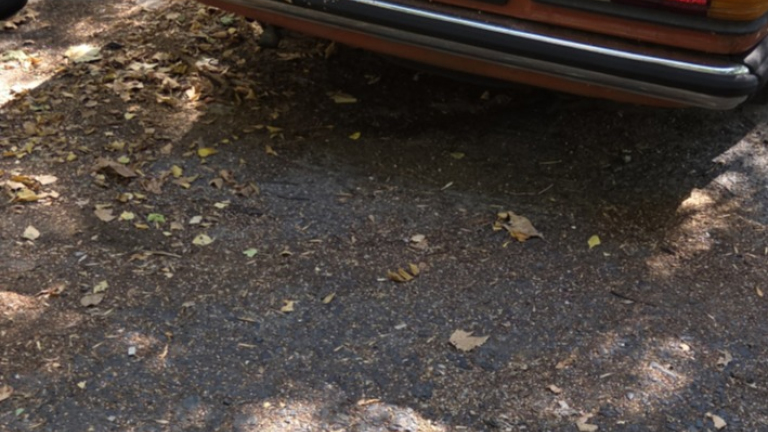 Hosszú ideje, lejárt műszakival áll egy Mercedes az óvoda és a játszótér közötti út mellett a sarkon