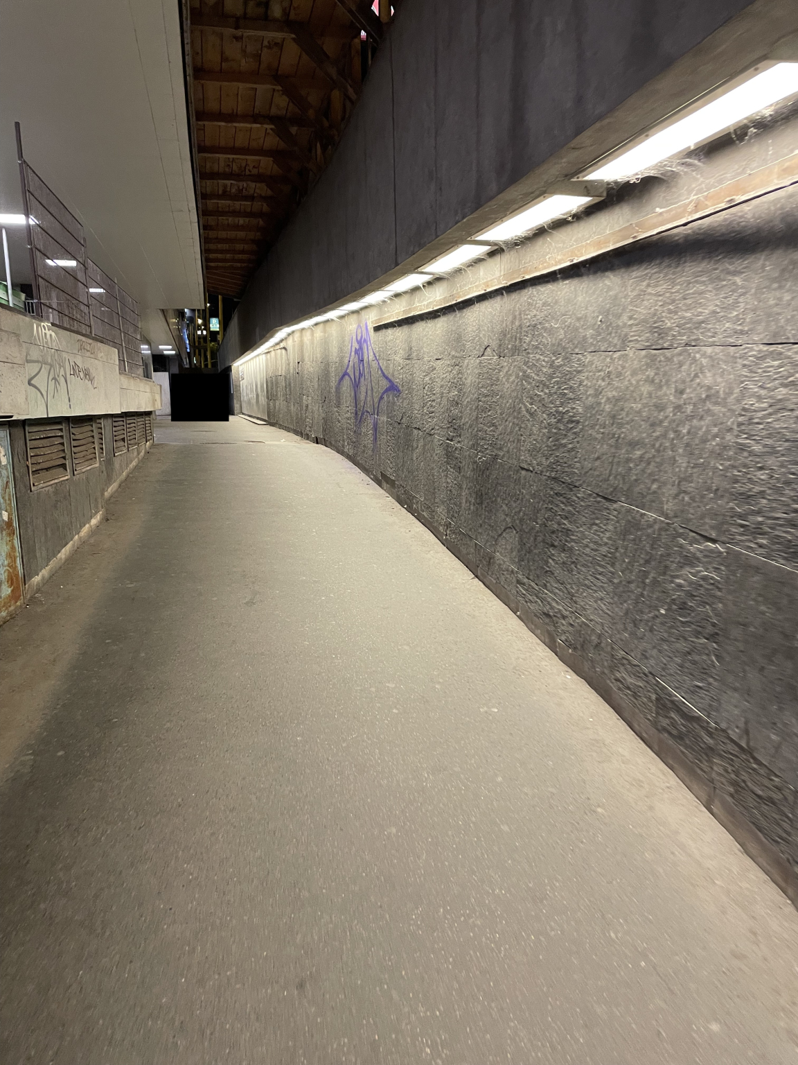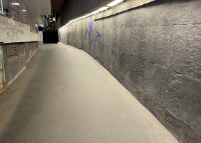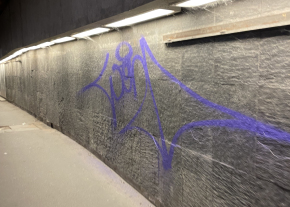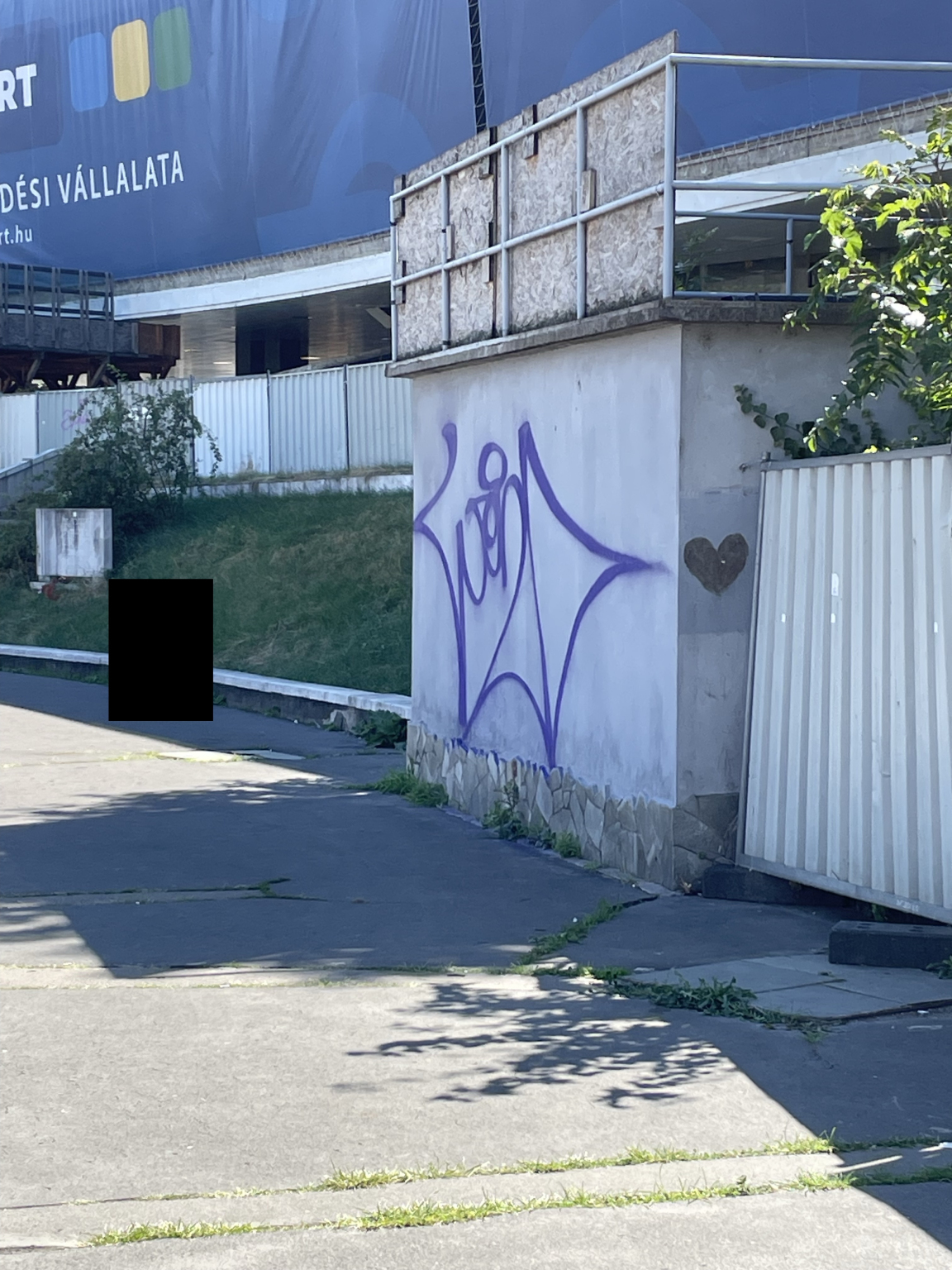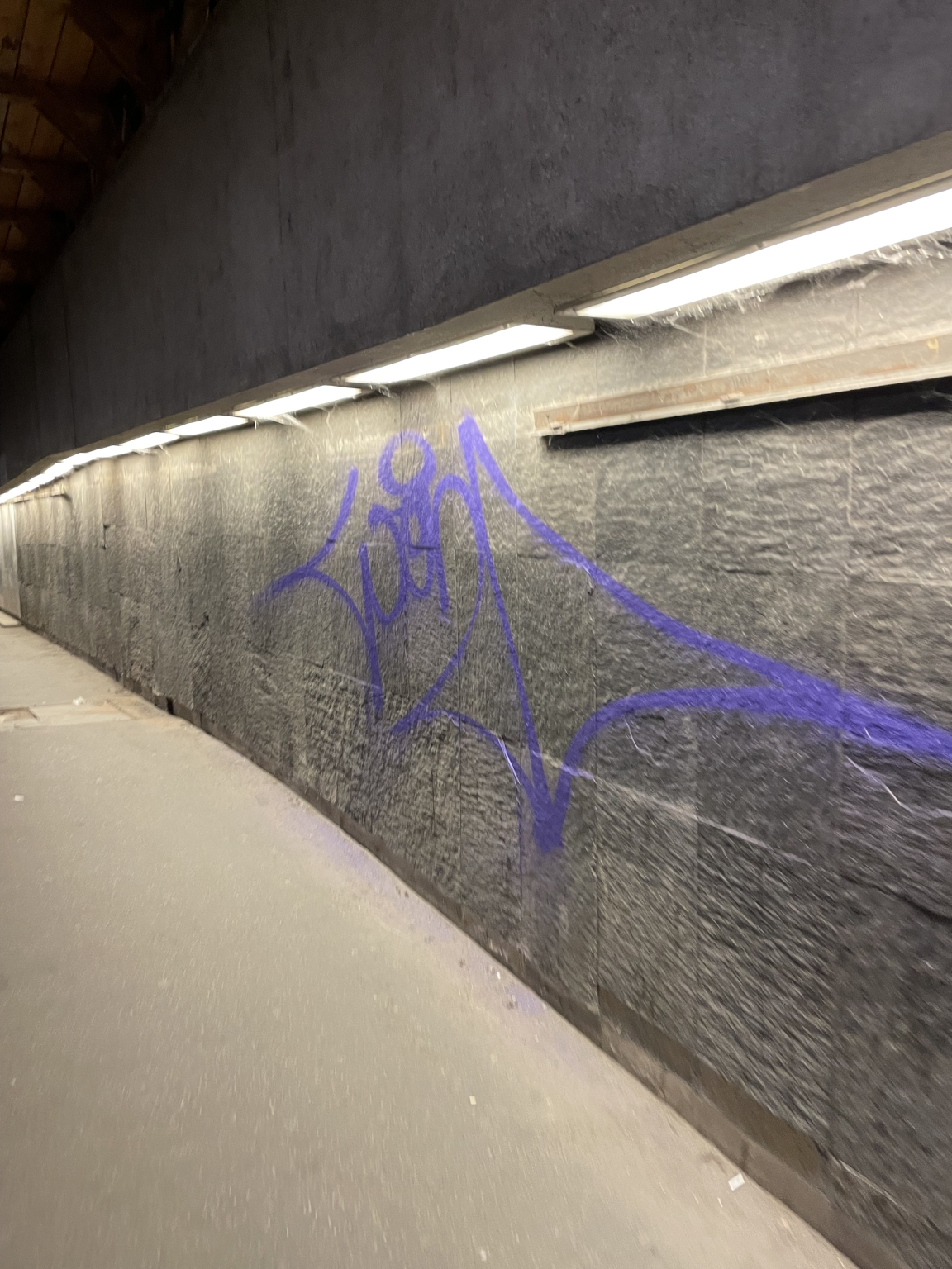 Pár nappal ezelőtt lila festékkel összegraffitiztek egy falat a Déli Pályaudvaron. Ugyanezt a lila mintát felfújták a jobbra található járda melletti fekete csempére is. Ha még nem történt meg, az érintettnek érdemes lenne feljelentést tennie.