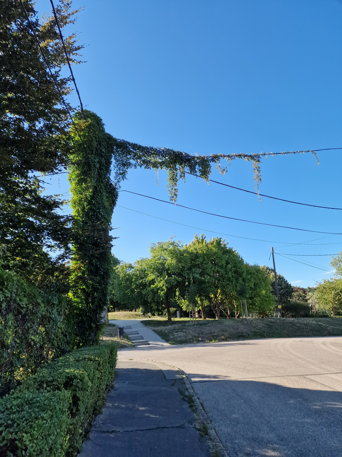 A Pannonhalmi út 58-nál a növényzet úgy benőtte a villanyoszlopot, hogy már a túloldalra is elkezdett átnőni az úttest fölött.