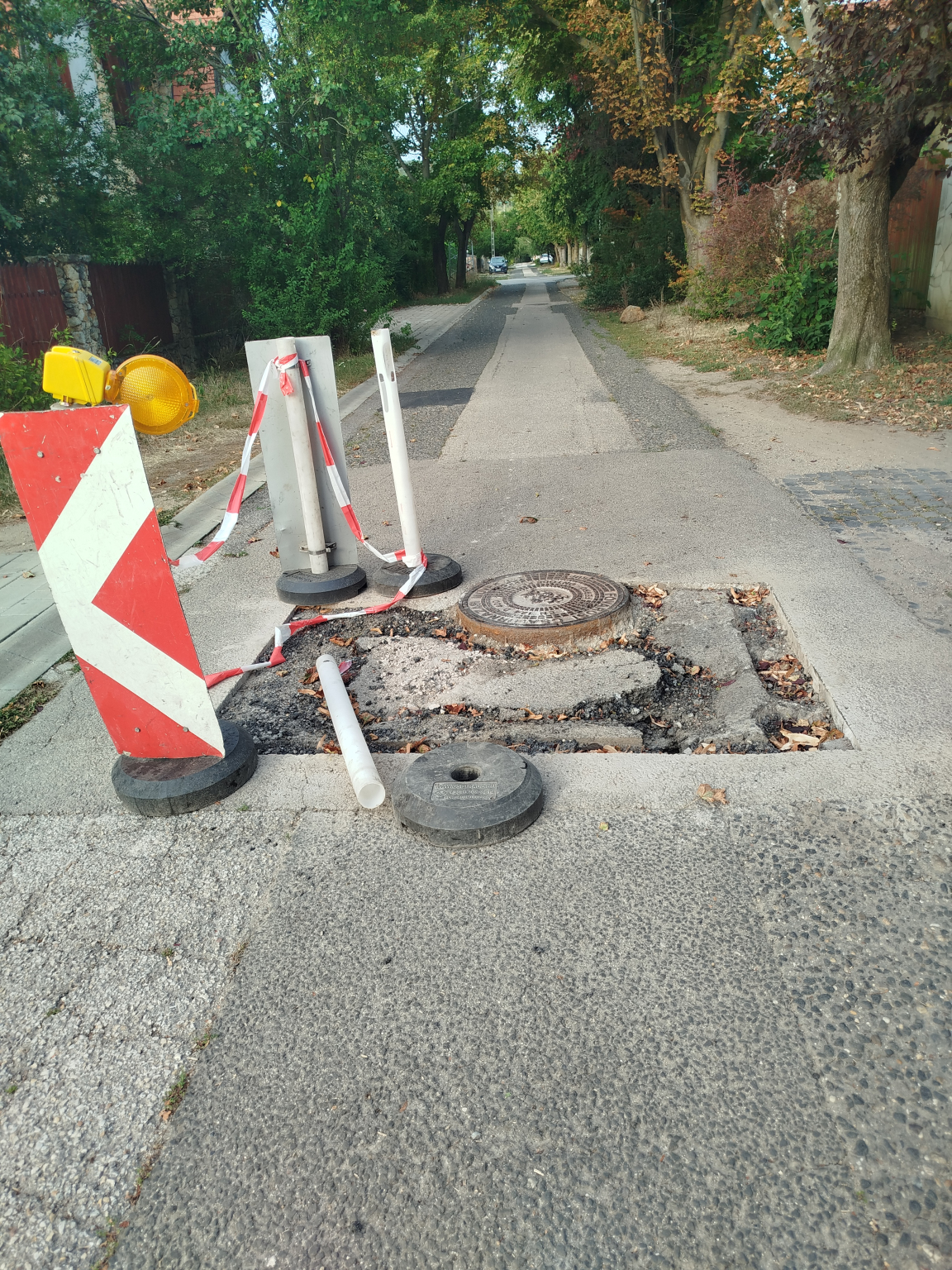 1028 Csokonai u 9 előtt, kátyúzáskor kb 2-3 hete, a csatonafedél környékét nem csinálták meg csak körbe kerítették. Mivel az utca szélességéből adódóan egyik oldalról sem könnyű kerülni, így a jelző oszlopokat részben összetörték, valamint egy oldalra helyezték. Kérem az illetéseket, hogy minél előbb intézkedjenek.