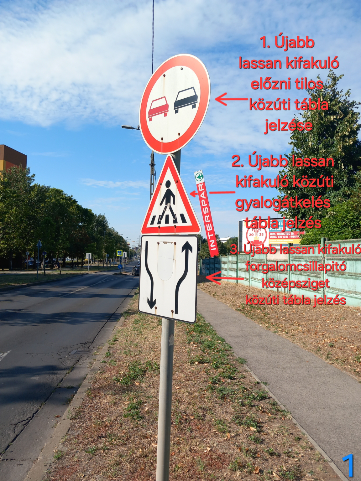 Értesítem hogy a Sibrik Miklós út vonalon Bányató utcai elhaladása után, Gőzmozdony utca buszmegálló felé az első oldalon az előzni tilos, Gyalogátkelés és forgalomcsillapitó középsziget közúti tábla jelzések lassan kifakulás látható, illetve közúti táblákhoz tartozó tizenegy csavarok teljesen rozsdásodotak, valamint a második oldalon az előzni tilos közúti tábla lassan kezd kifakulóvá válni a tábla jelzése
