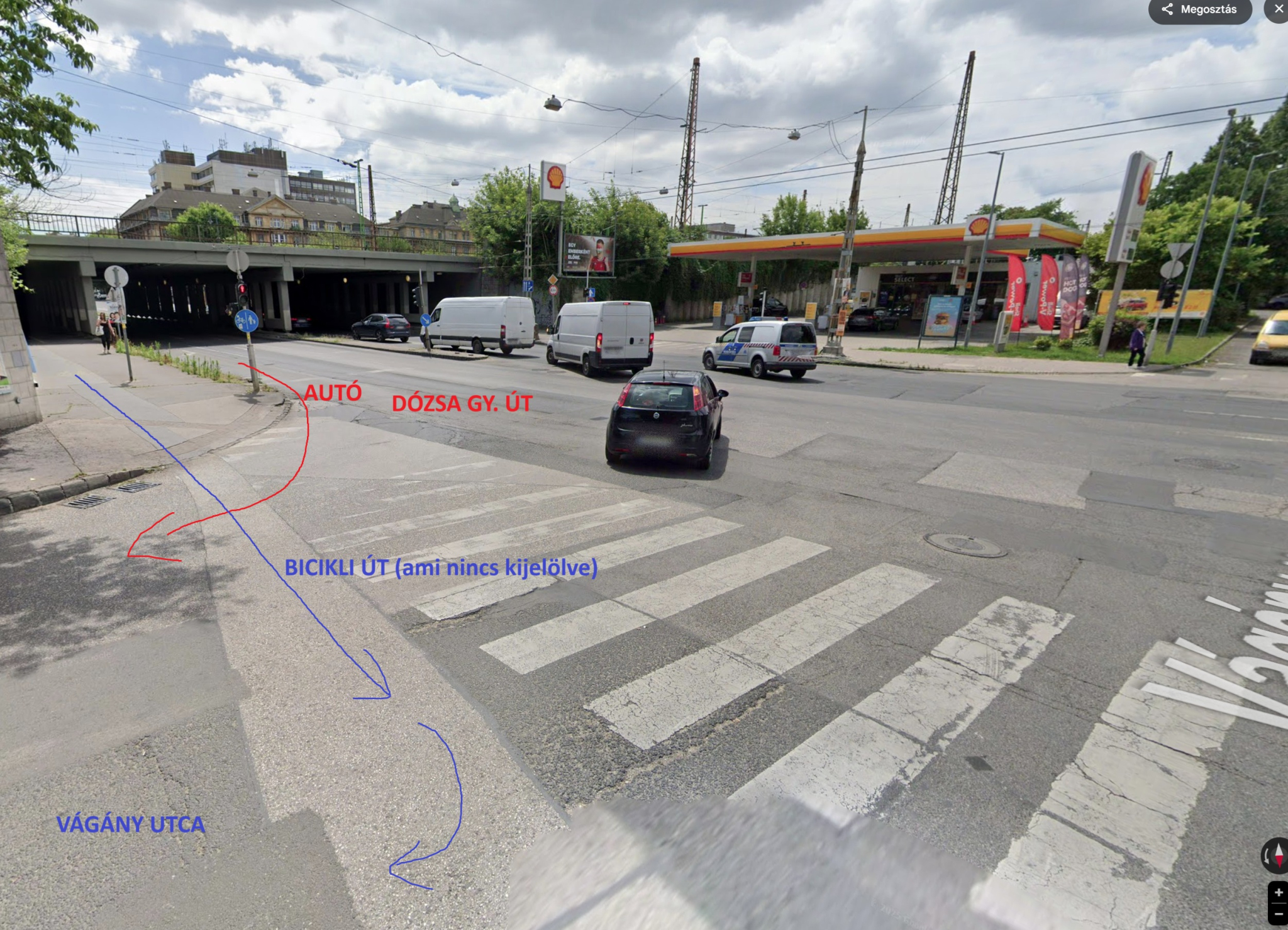 Dózsa György út, Vágány utca kereszteződés, bicikliút