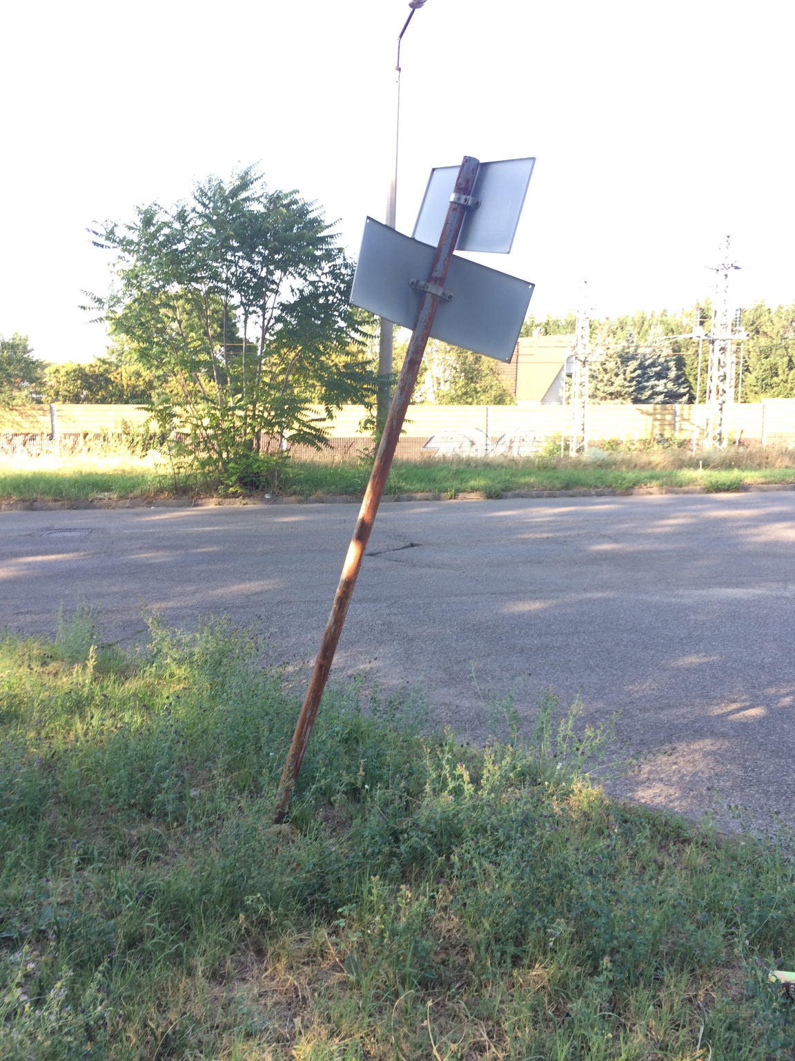 Jelzett helyszínen lévő tábla a kidőlés szélén áll, oszlopa rendkívül rozsdás.