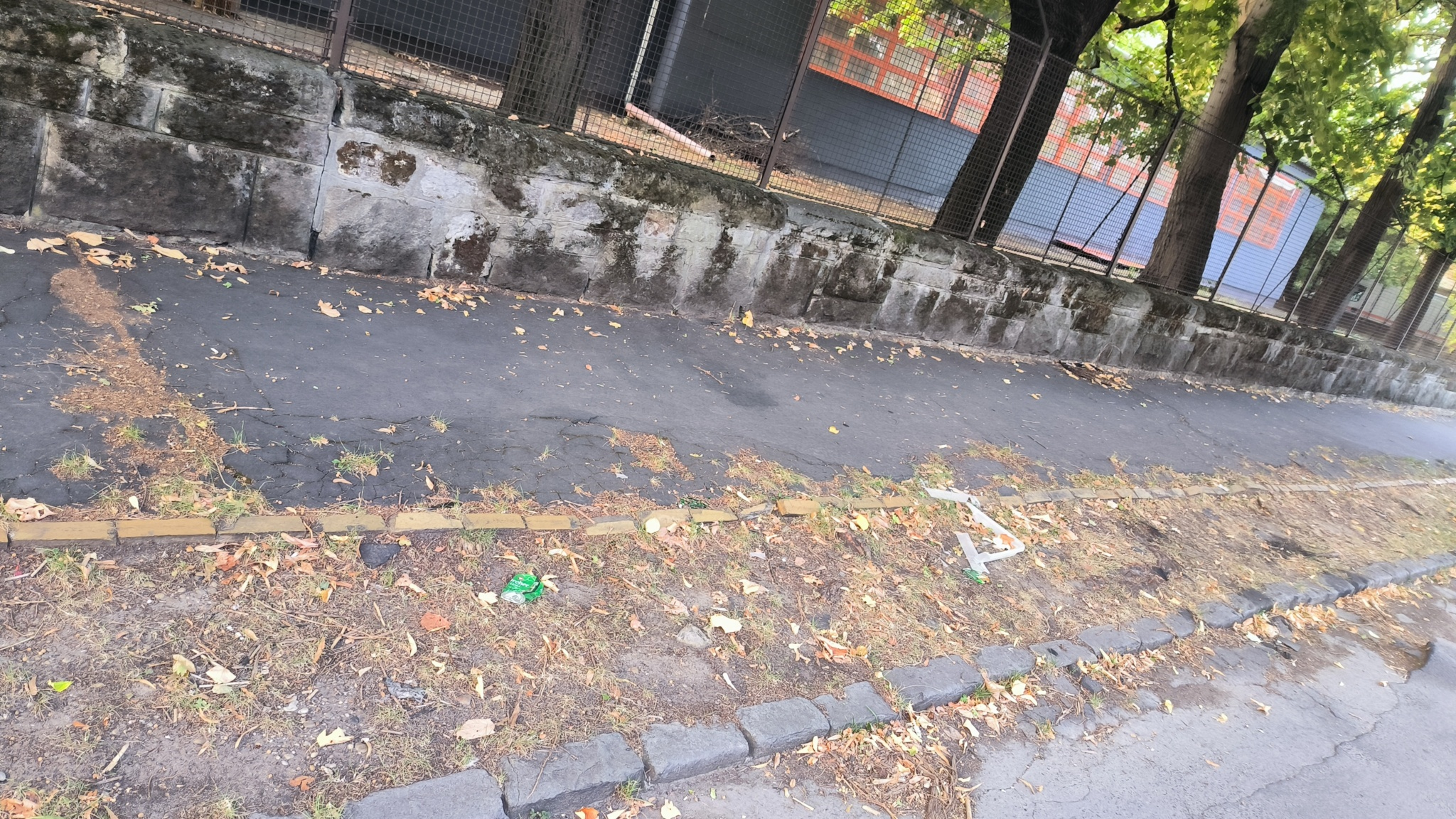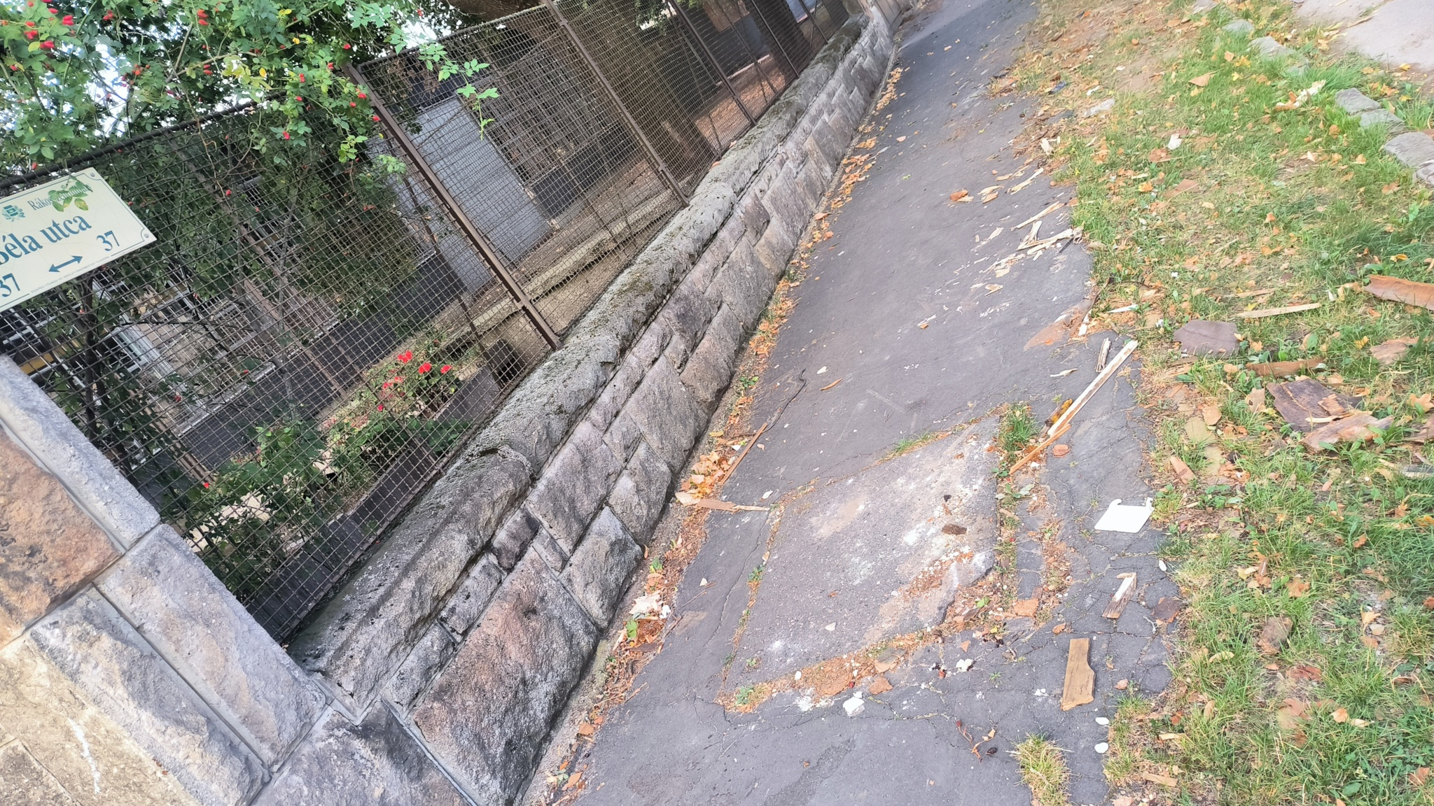 Szemét, törmelék és hulladék a járdán és zöldterületen.