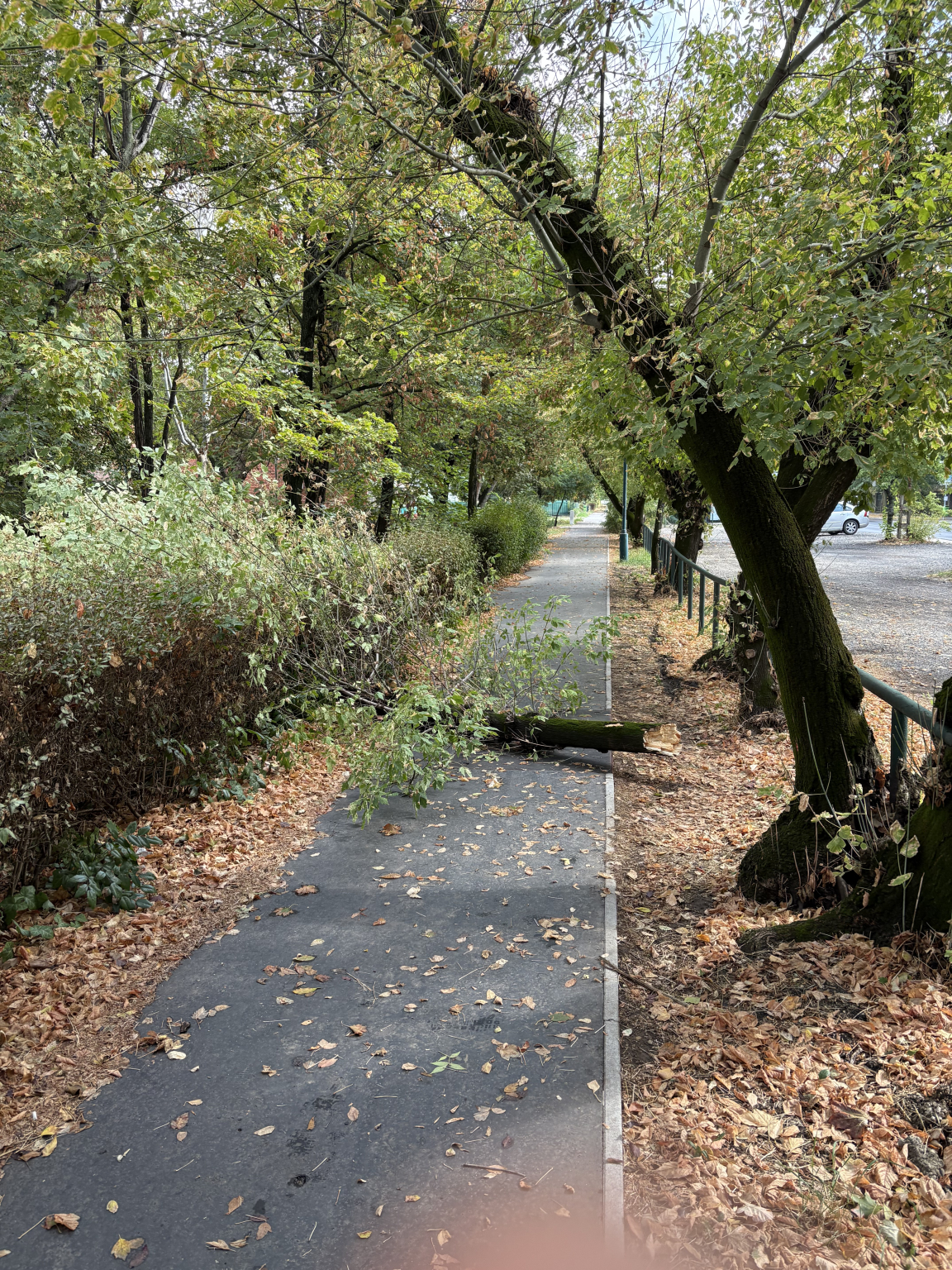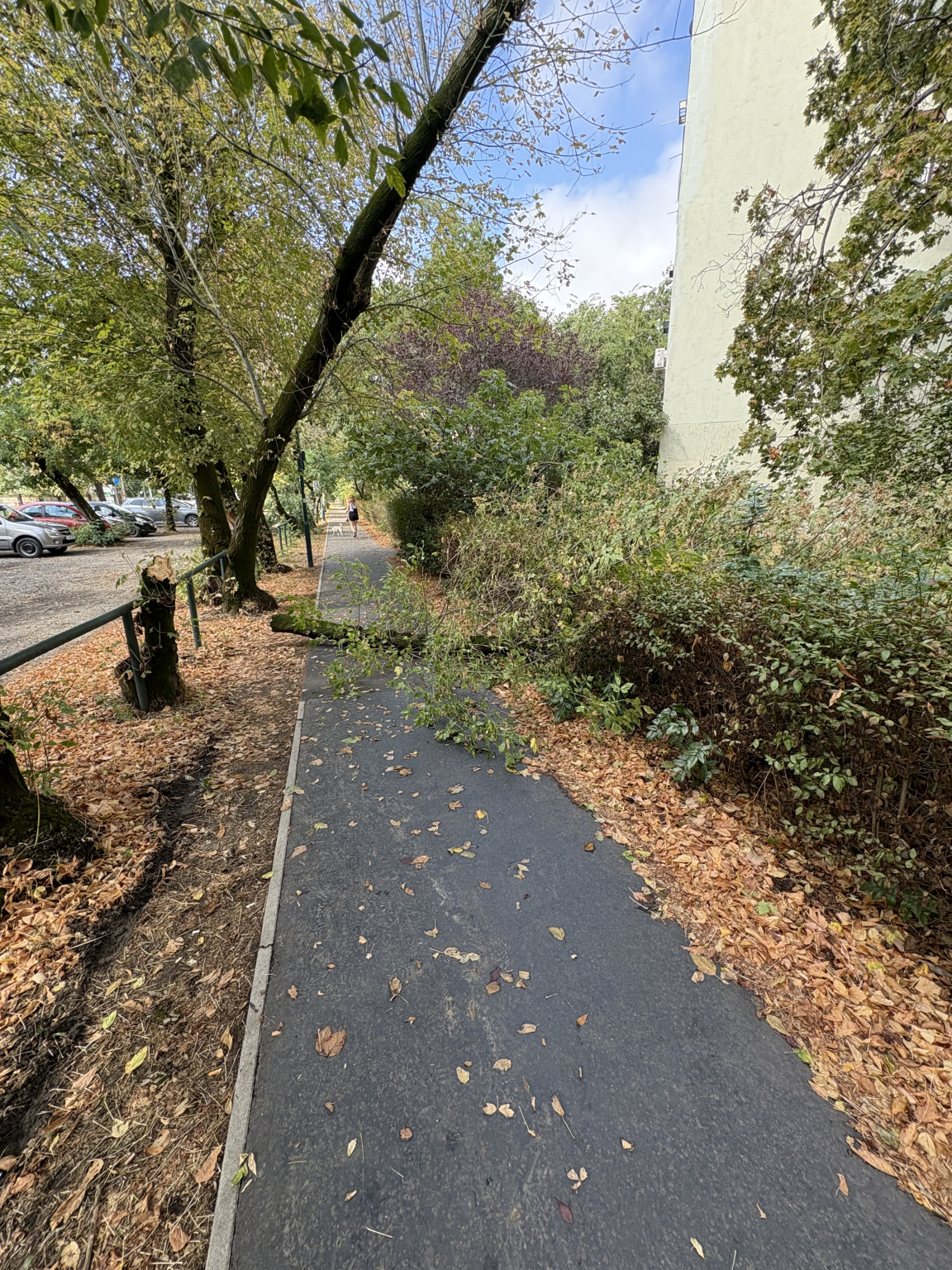 Az egyik járda melletti akác egy vastag ága a tegnapi viharban a járdára dőlt keresztben, akadályozva a közlekedést.