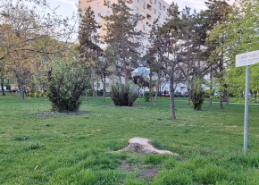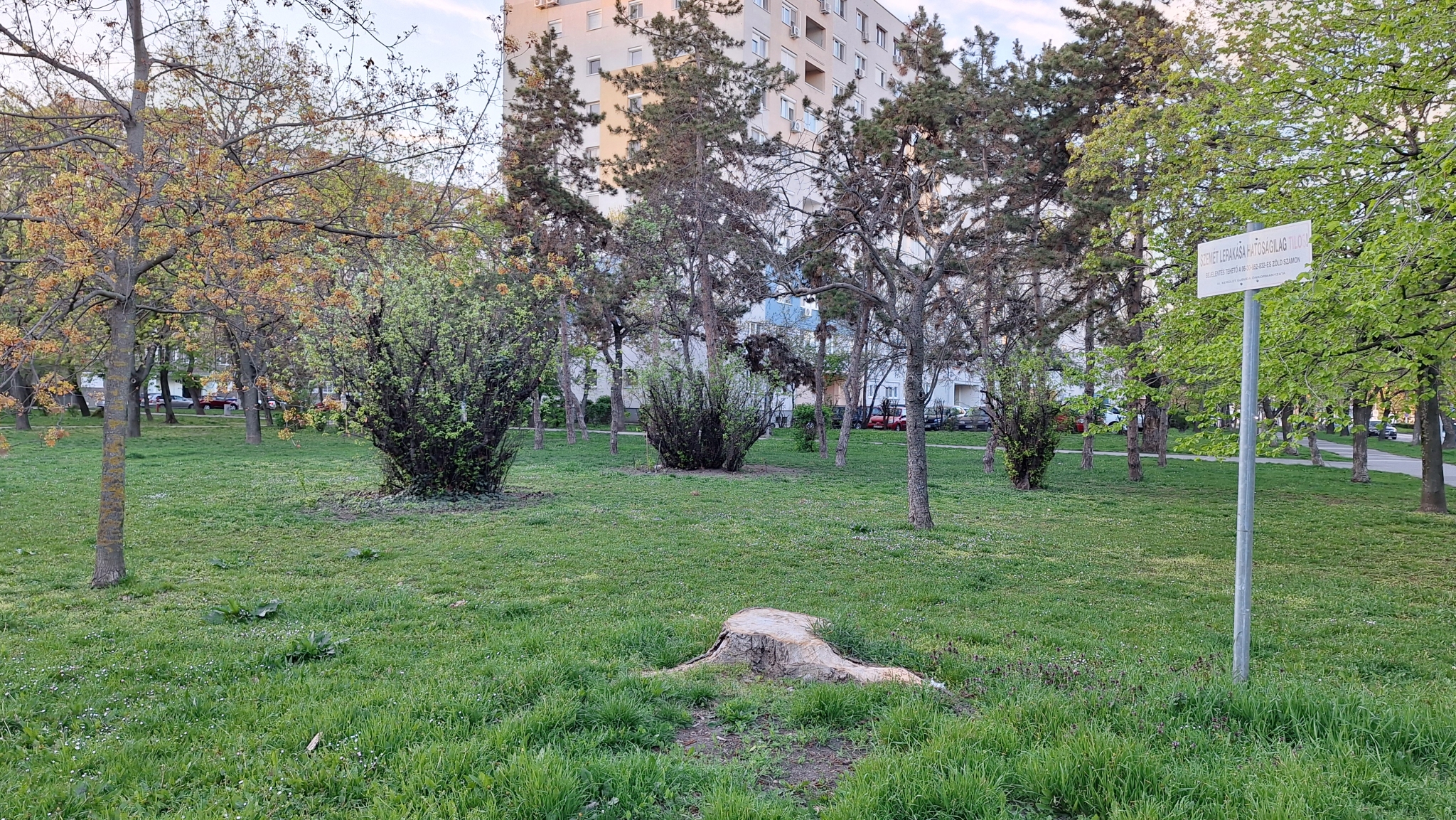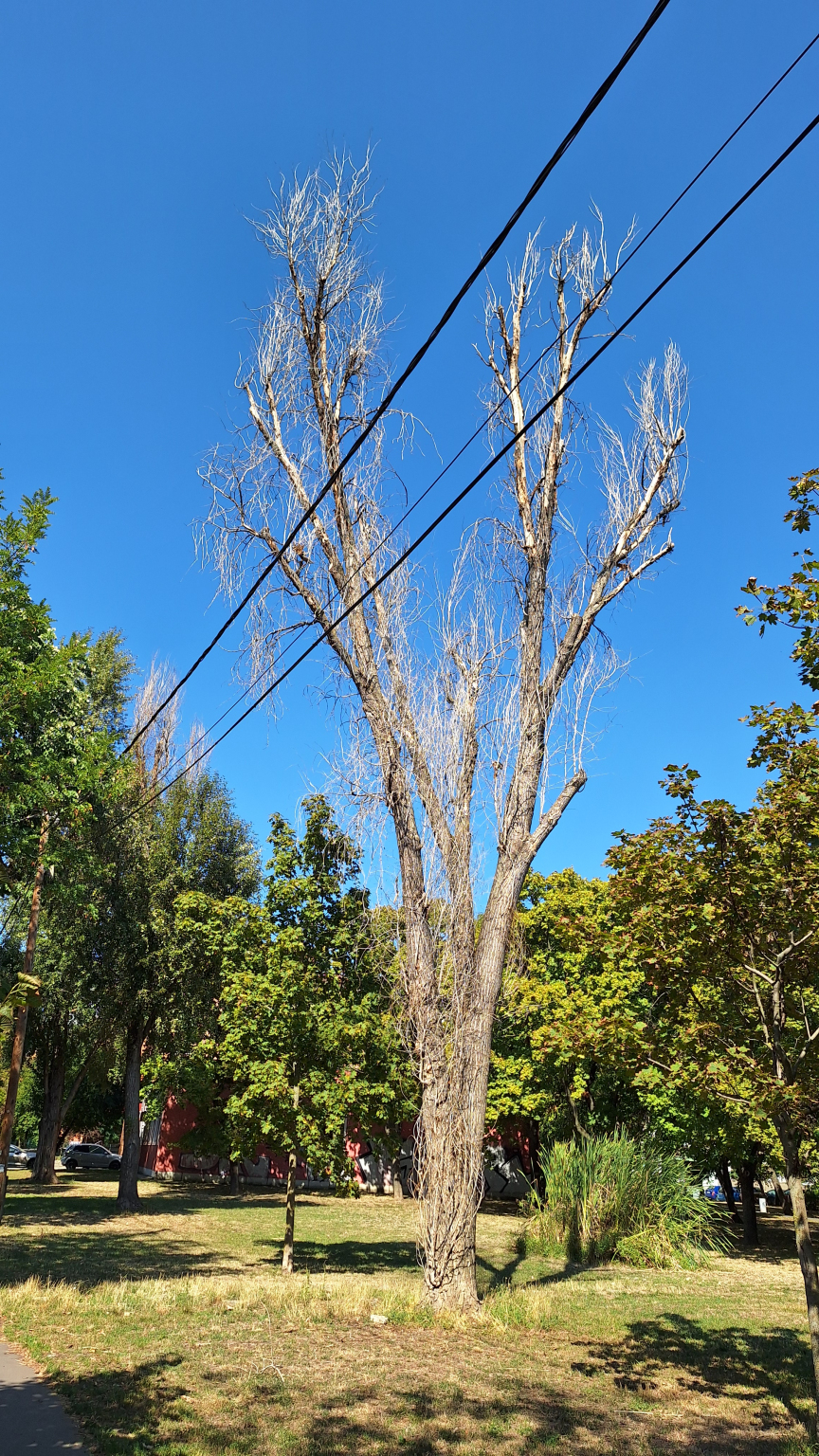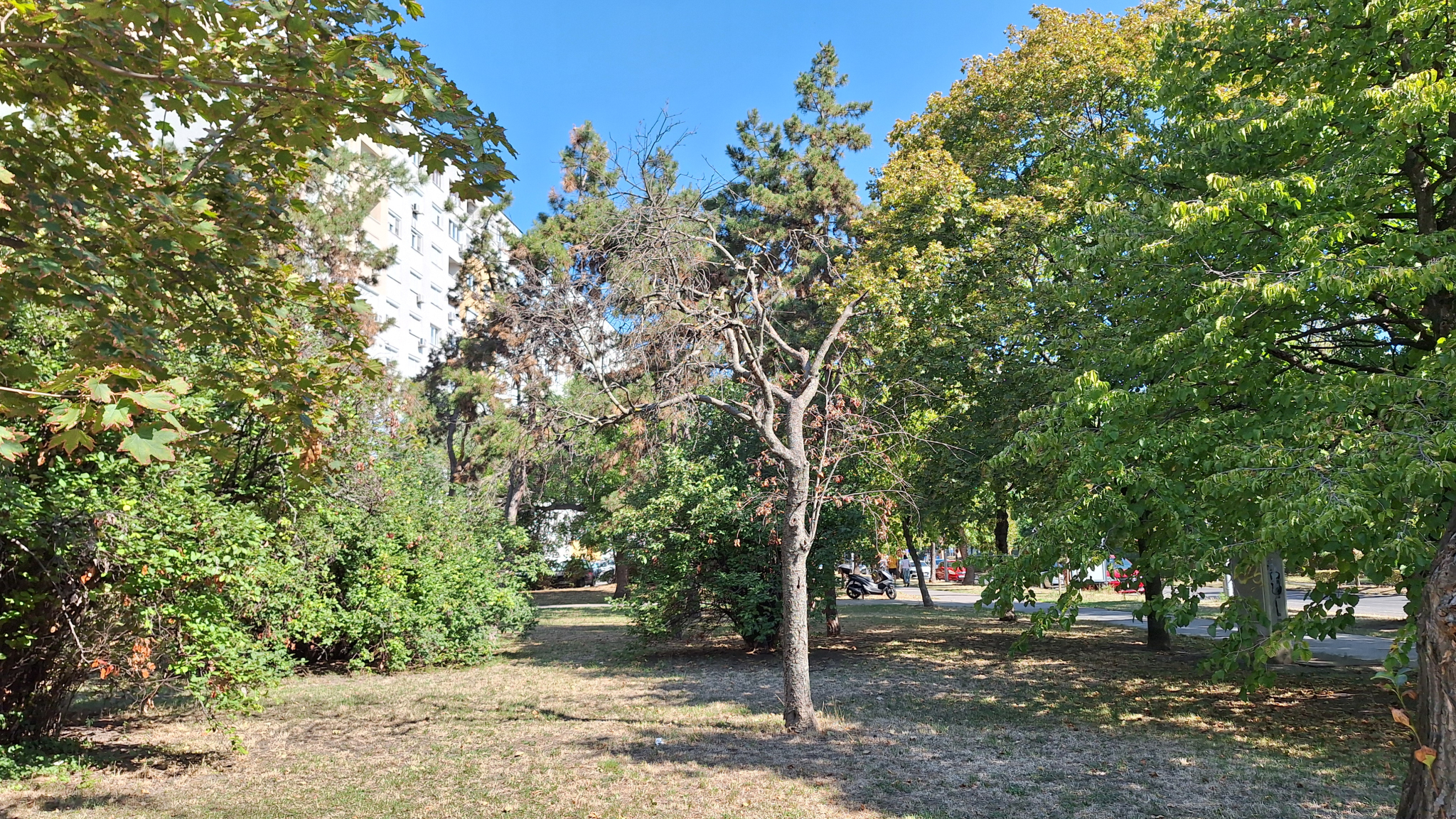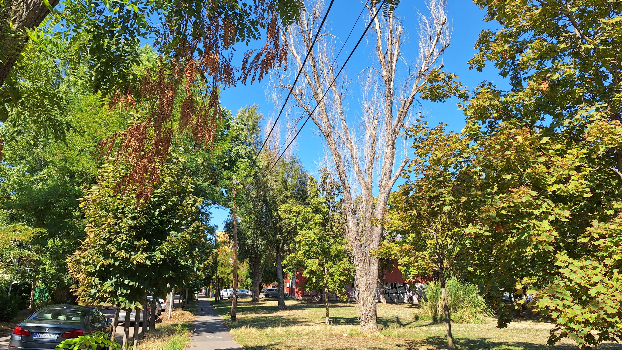 A Bikszárdi utca 26-al szembeni parkocskában áll két kiszáradt fa.