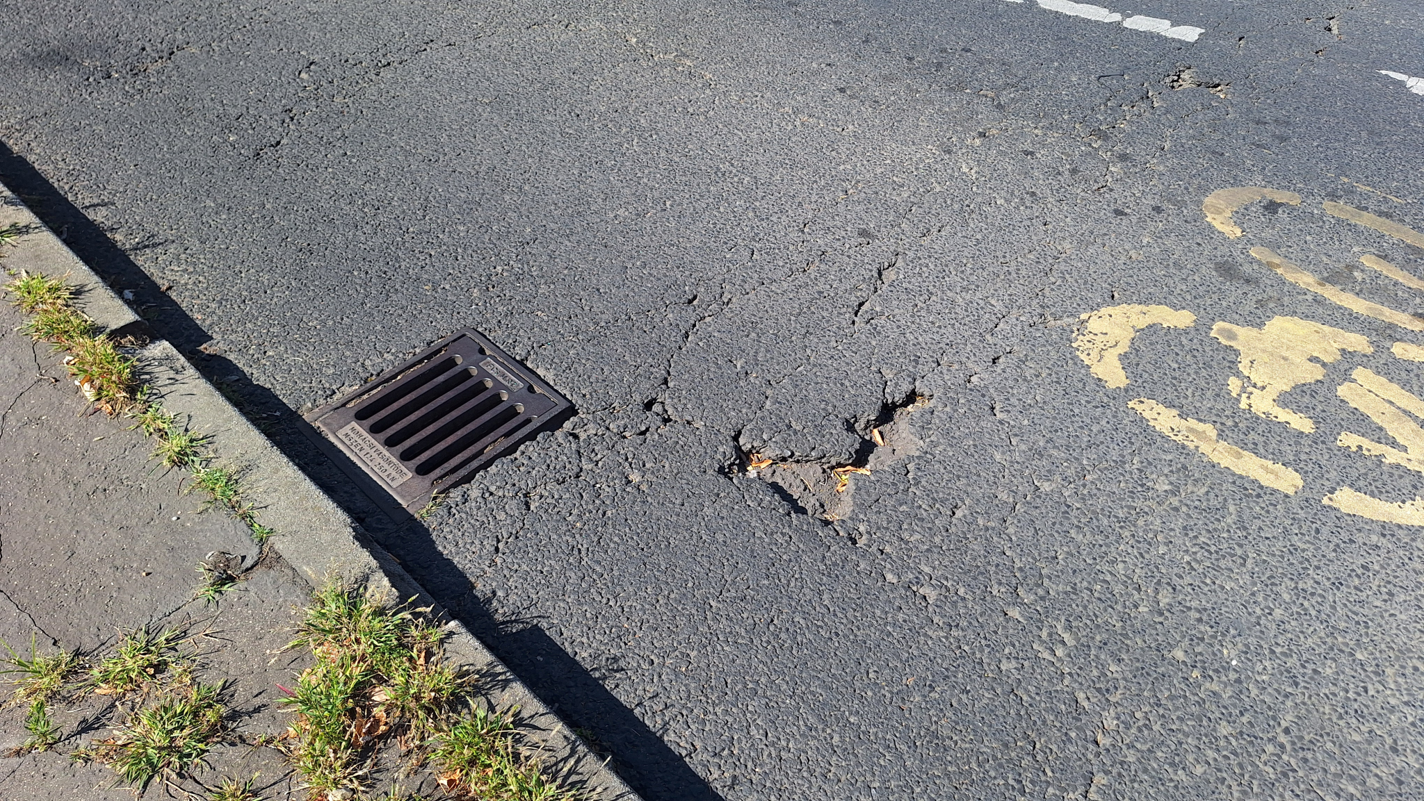 A Tétényi út 2-nél kátyú kezd kialakulni az úttesten.