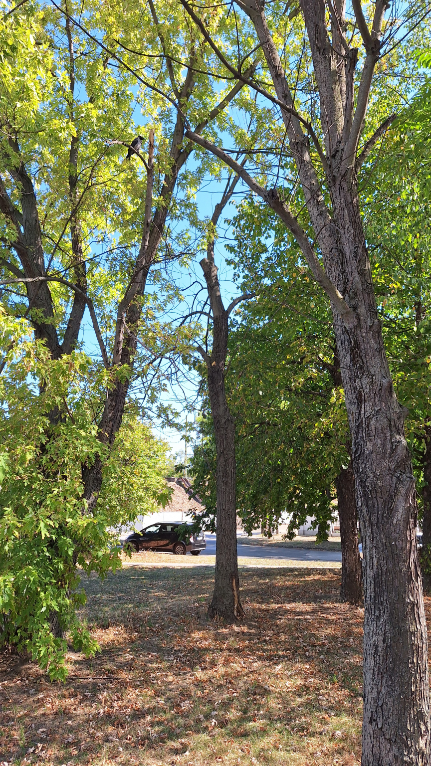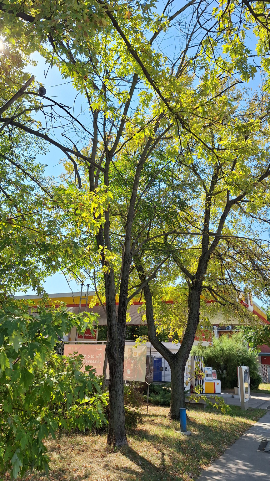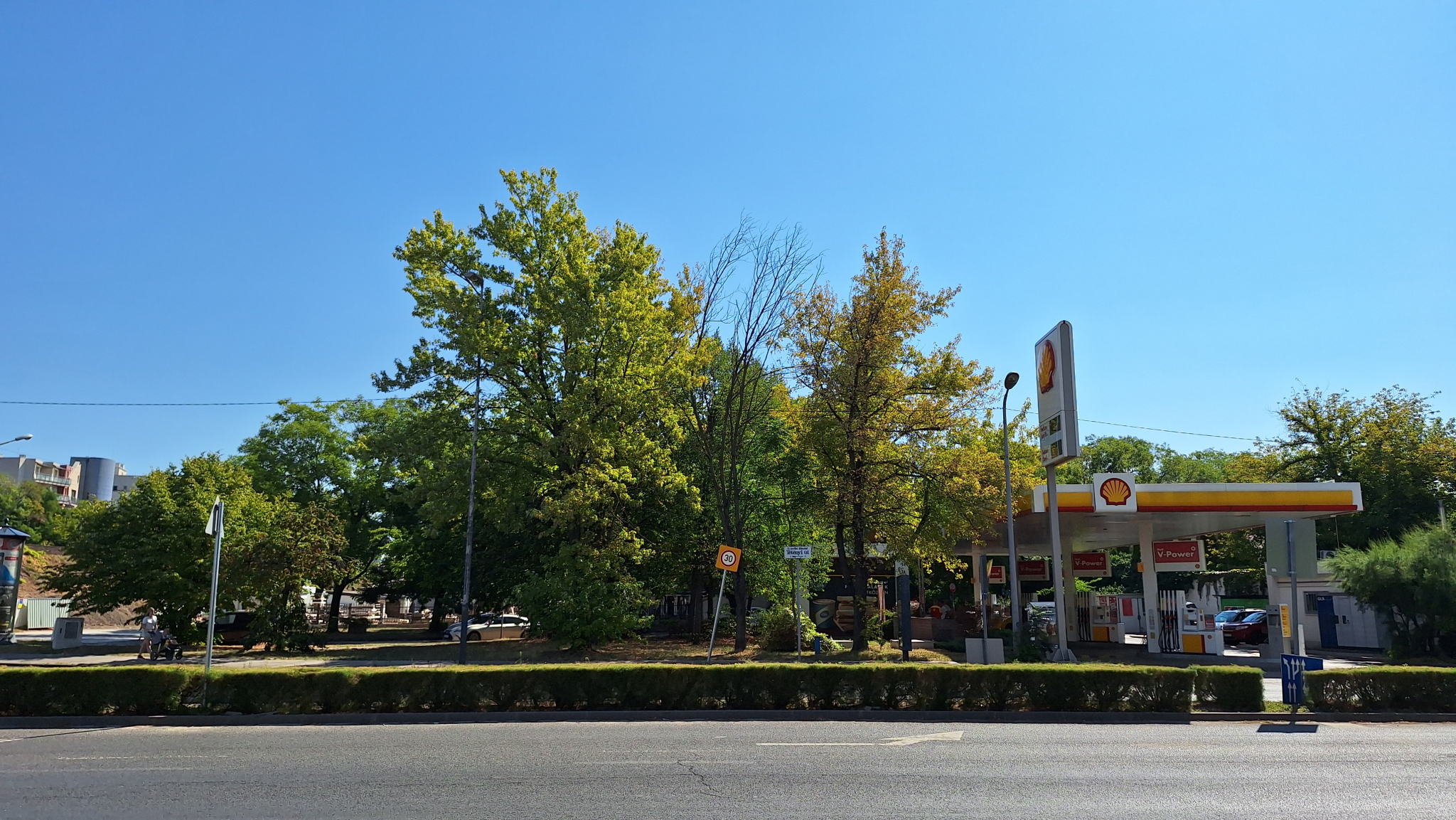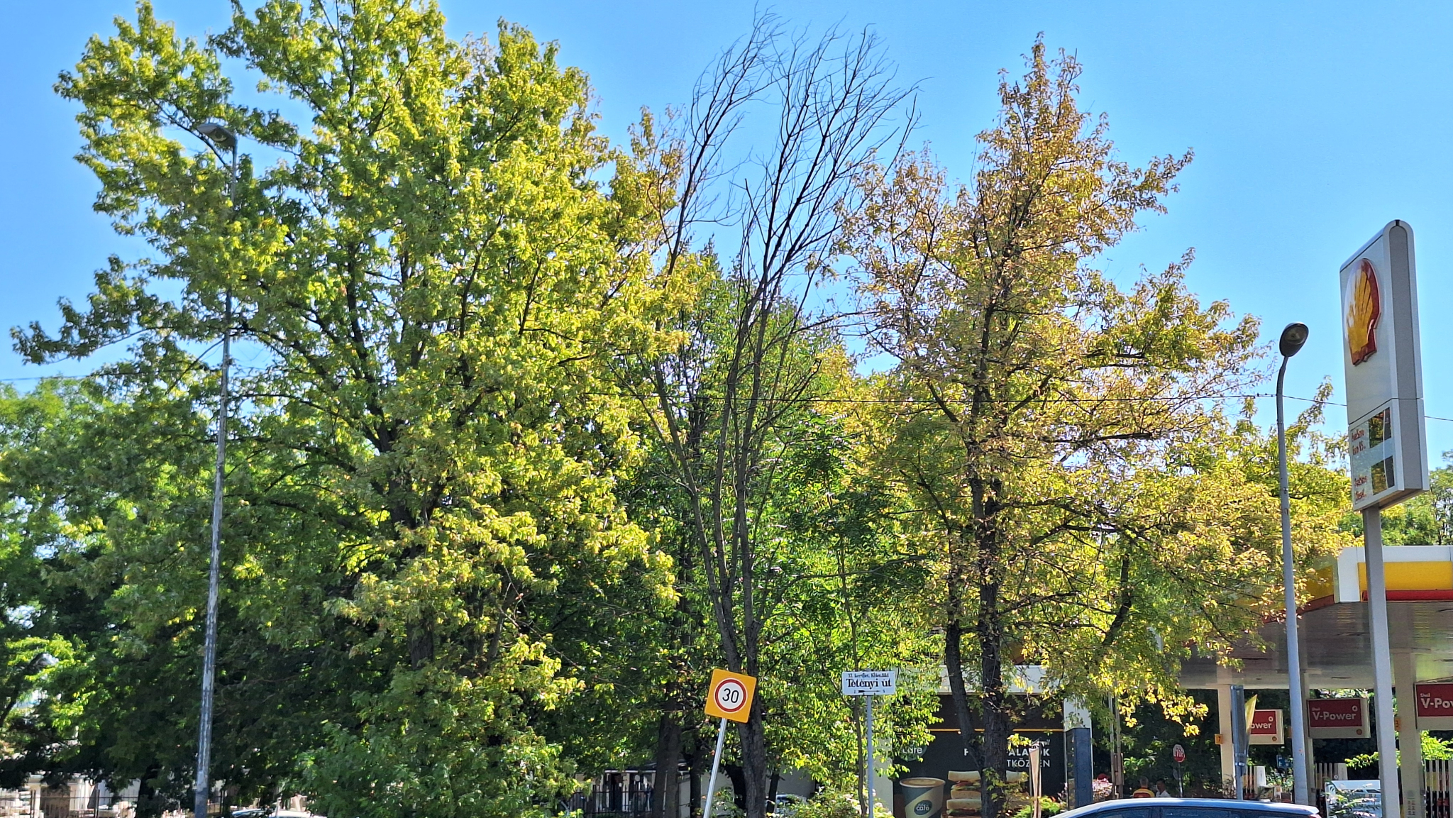 A Tétényi út 2. alatti benzinkút mellett áll két kiszáradt fa.