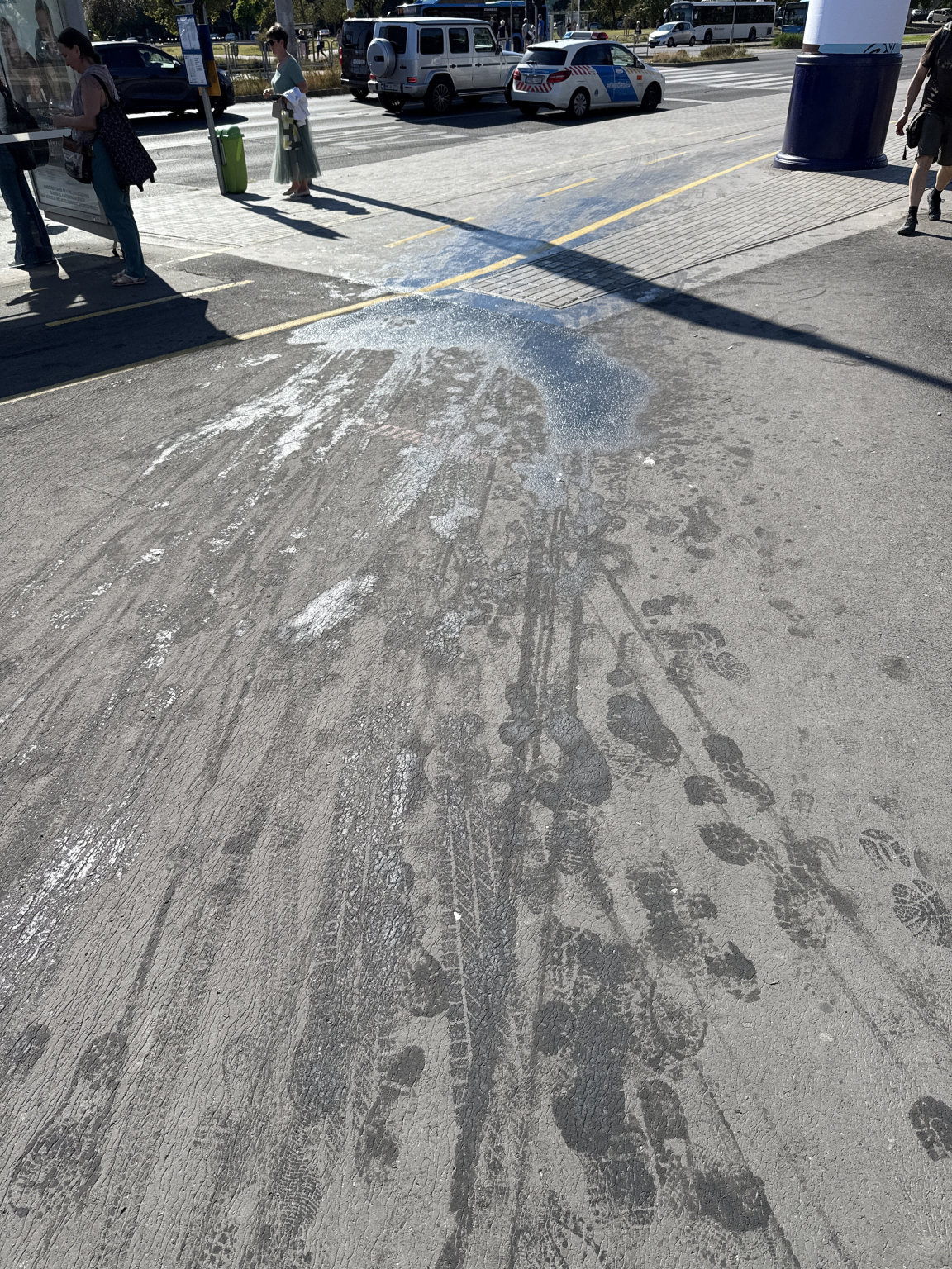 Valahonnan nagy mennyiségű olajos szennyeződés került a kerékpárútra éj a járdára. Csúszásveszélyes, büdös, és környezetszennyező.
