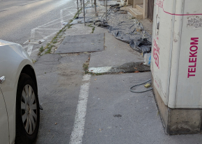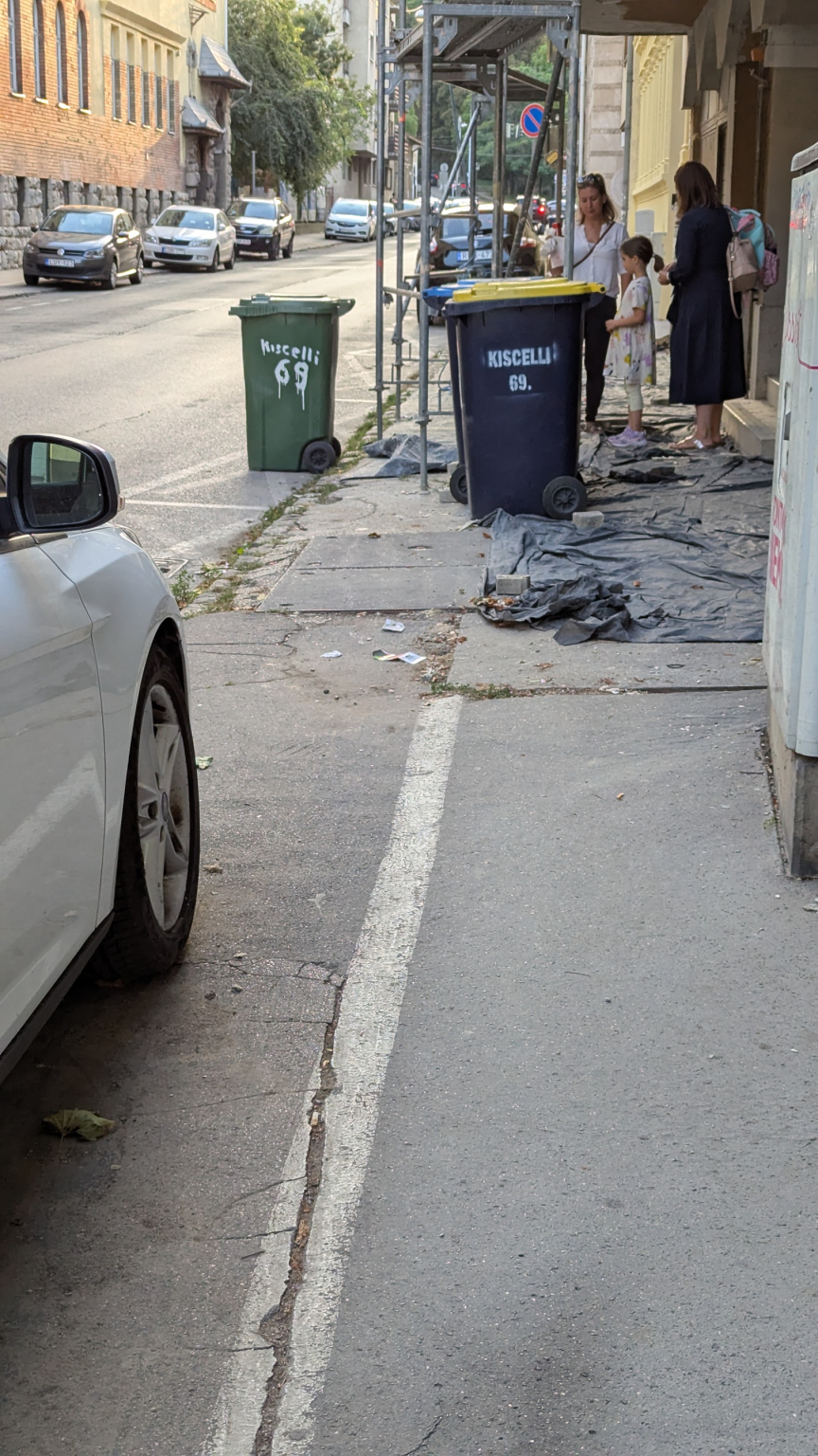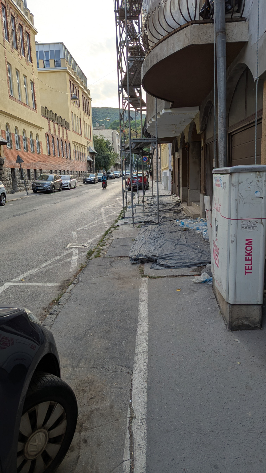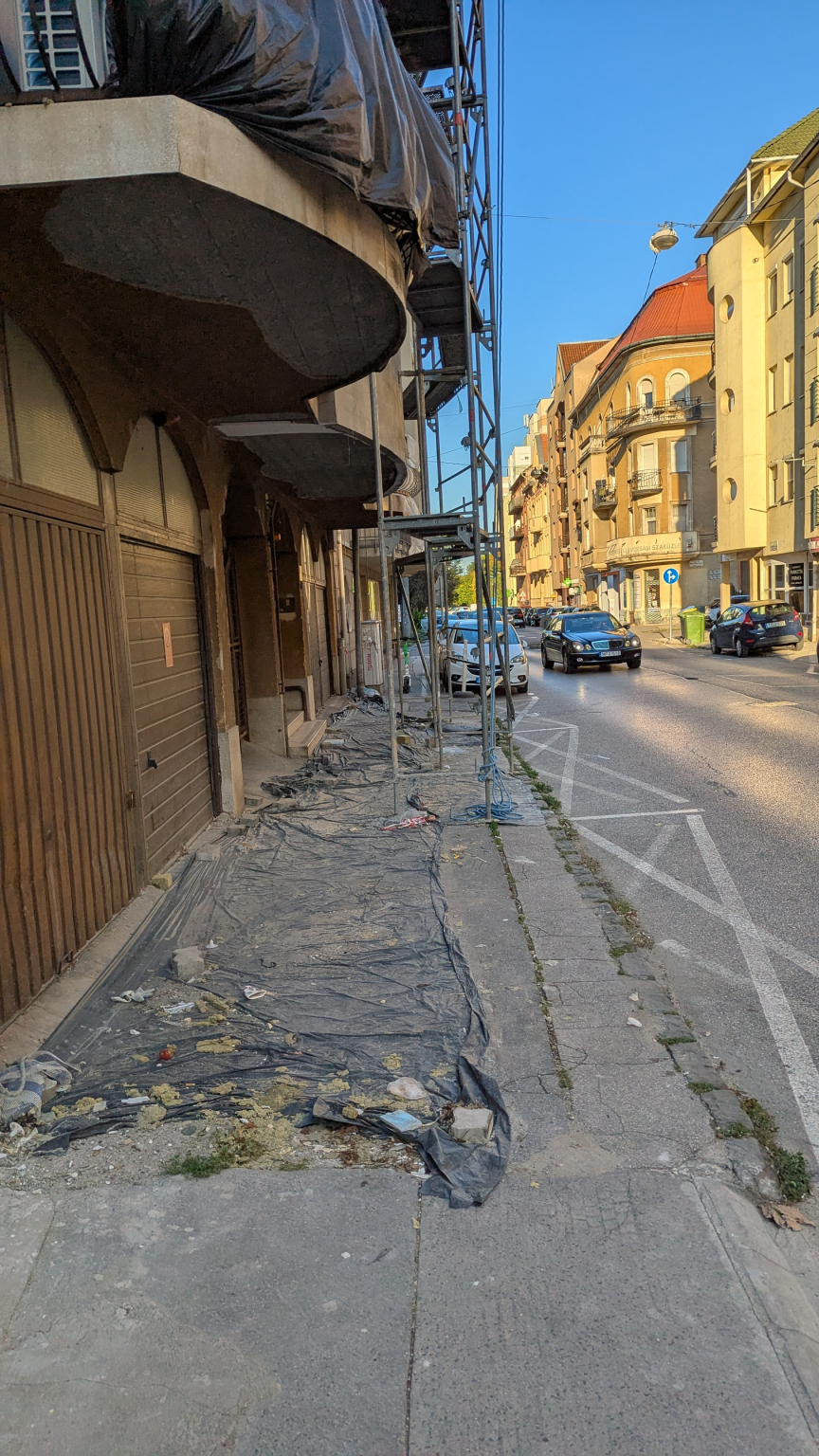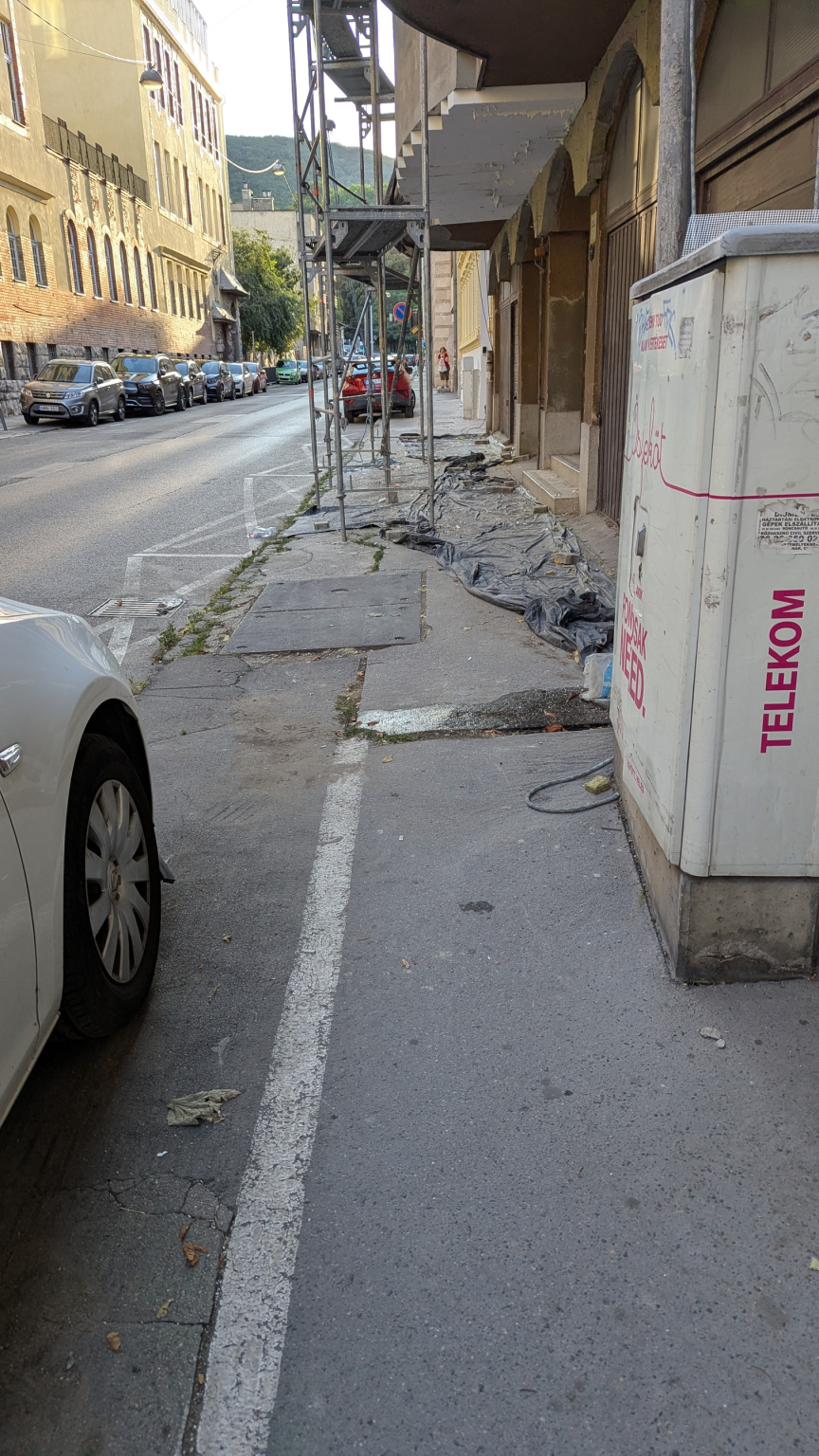 A helyzet különösen veszélyes a szemközti iskolába érkező gyerekek szempontjából, hiszen csak az úttesten keresztül tudnak továbbhaladni, illetve az állvány alá be tudnak sétálni, ahol építési baleset érheti őket.