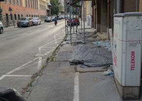 A Kiscelli u. 69. számú épület felújítása kapcsán az építési állvány elfoglalja a járdát. A gyalogosforgalom számára az állvány mellett nincs elkerített közlekedő felület kialakítva, a gyalogosoknak ezért az úttestre kell lépniük. Az építési terület nincs elkorlátozva.