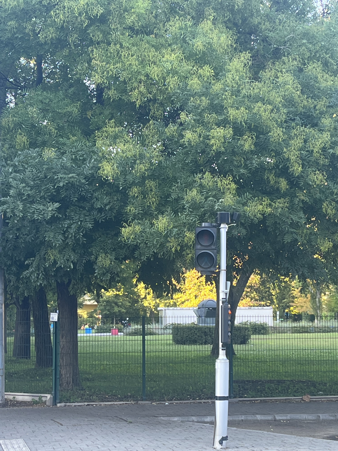 A Kárpát és a Bessenyei utca sarkán lévő gyalogos jelzőlámpa zöldje nem világít. Ez az a sarok, amely a RAM kertje felől esik.