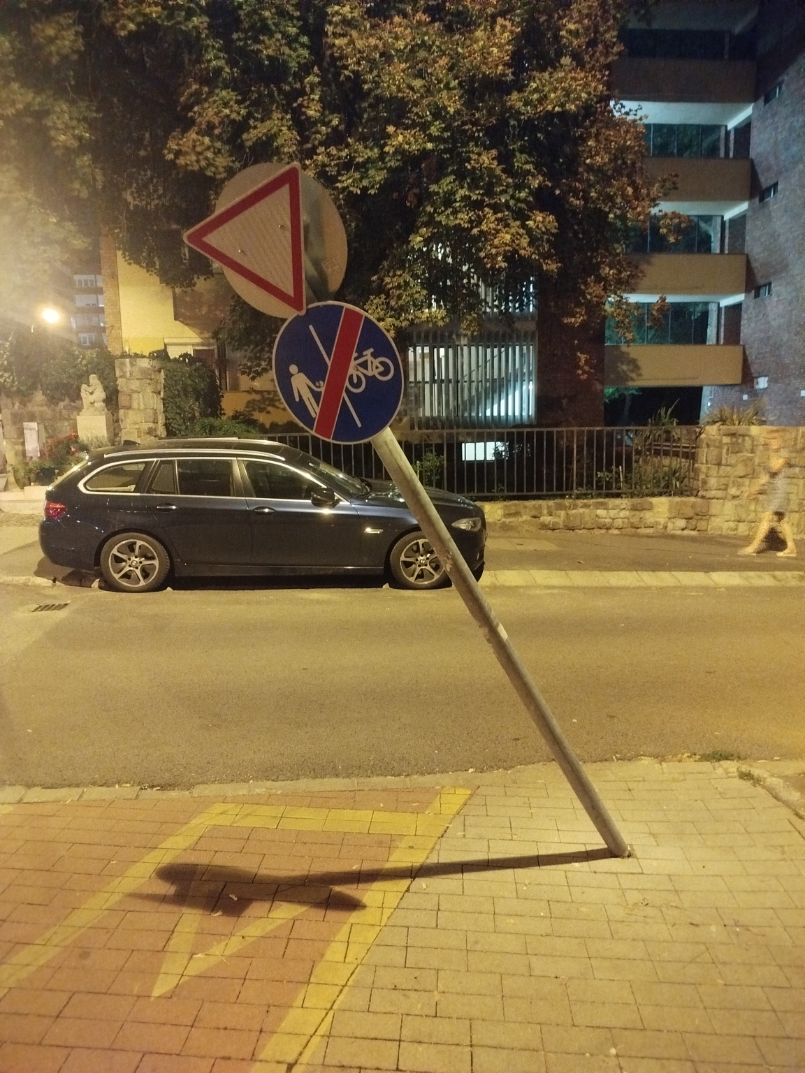 Kidöntött kresztábla veszélyesen belóg a kerékpáros útba a Kacsa utca végénél.