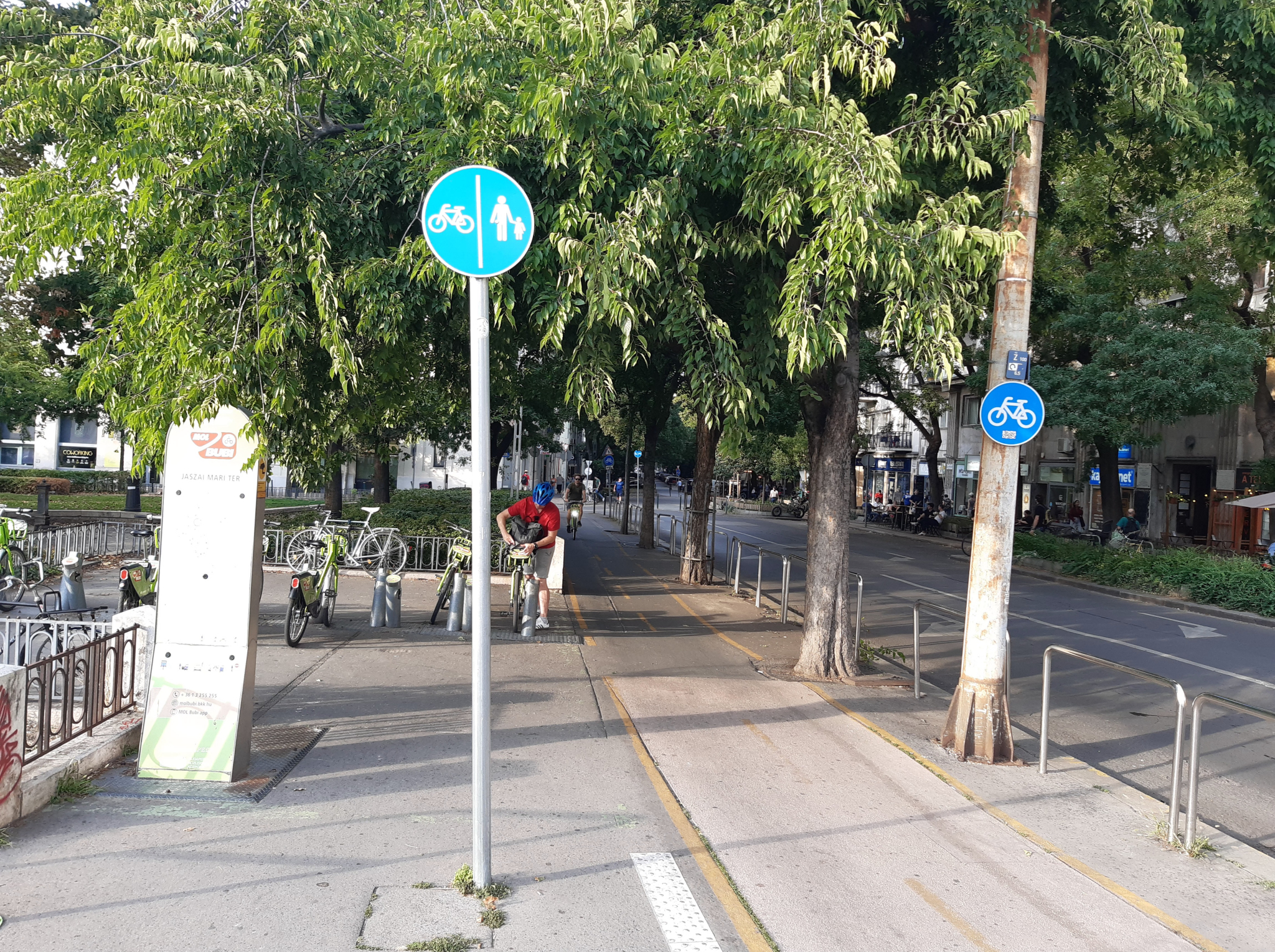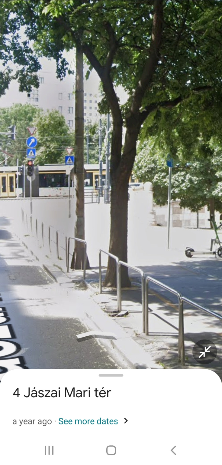 A XIII. kerület Jászai Mari téren az első fotón látható két KRESZ tábla ellentmond egymásnak. Ennek oka, hogy a bal oldali, azaz az osztott gyalog- és kerékpárút meg lett fordítva. A második kép -Google Street View -mutatja, hogy egy évvel ezelőtt még helyesen állt. Kérem, hogy fordítsák vissza.