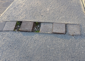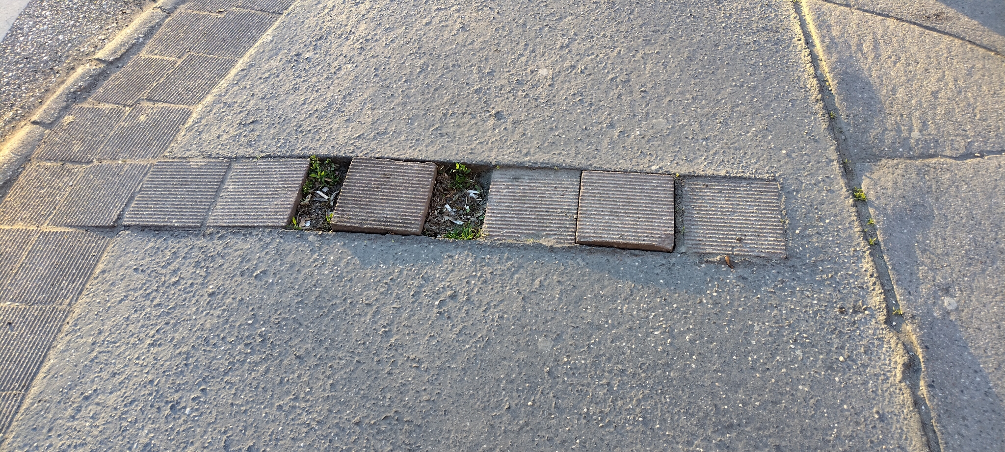 Hiányzik egy elem, a látássérülteknek segítő kősorból, valaki könnyen megtud botlani benne. Kérem az illetékest hogy pótolják.