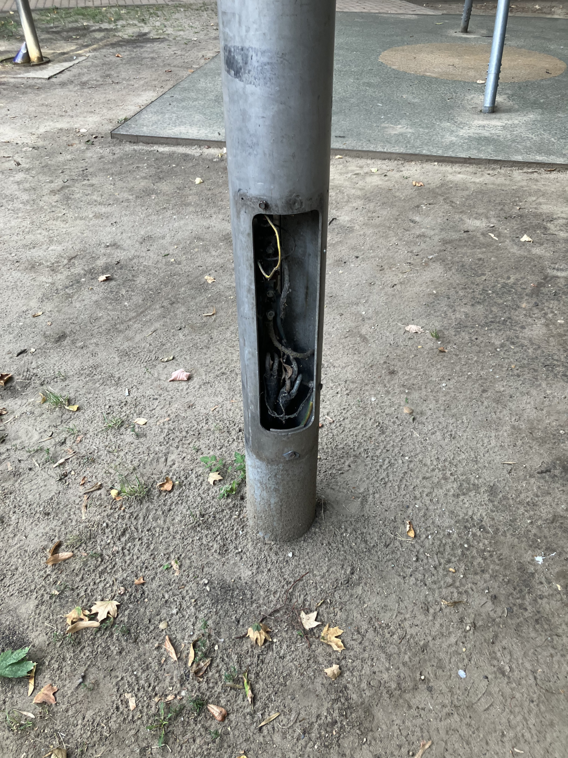 A 9.kerületben a Mihálkovics utca 12-vel szemben lévő játszótéren az egyik villanyoszlopnak nincsen meg az “ajtaja”, így szabadon vannak a vezetékek.