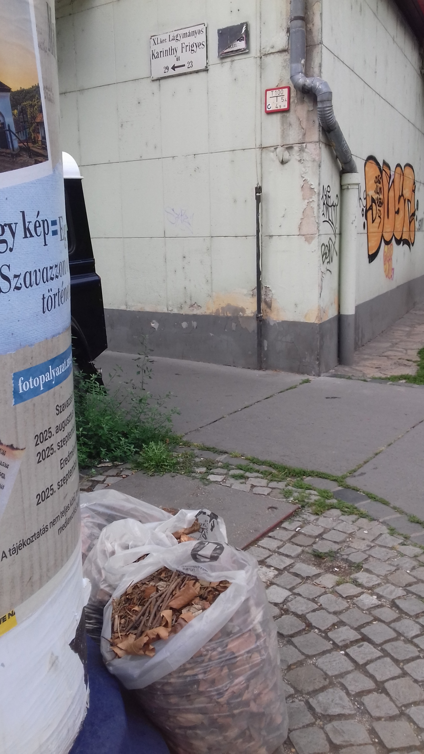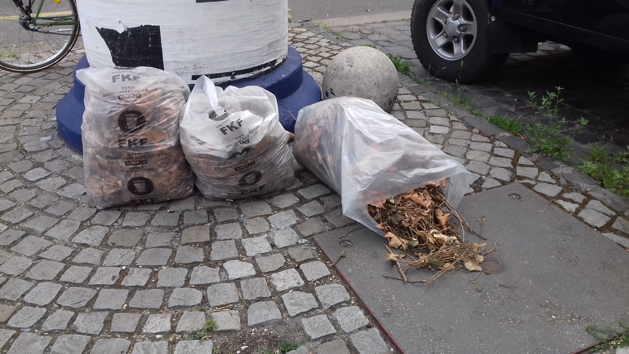 XI. kerület Karinthy Frigyes út – Budafoki út sarokról hetet óta nem lettek elszállítva a zöldhulladék-gyűjtő zsákok.